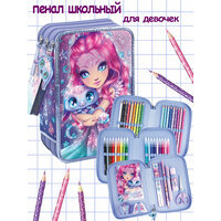 Школьный пенал с полным набором канцелярских принадлежностей. Состоит из трёх отделений, закрывающихся на молнию. Яркий и привлекательный дизайн, большая вместительность и безупречное качество. У пенала устойчивый тканевый каркас, все отделения закрываются на молнию, внутри оборудован органайзером для размещения канцелярских принадлежностей. Материал - 100% полиэстер. Комплектация: пенал (3 отделения), блокнот для занятий и раскрашивания, 18 маркеров, 18 цветных карандашей, коллекционный ластик, ножницы, клей-карандаш, точилка для карандашей, линейка, 4-цветная шариковая ручка, простой карандаш.