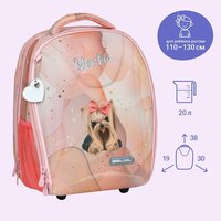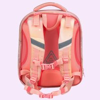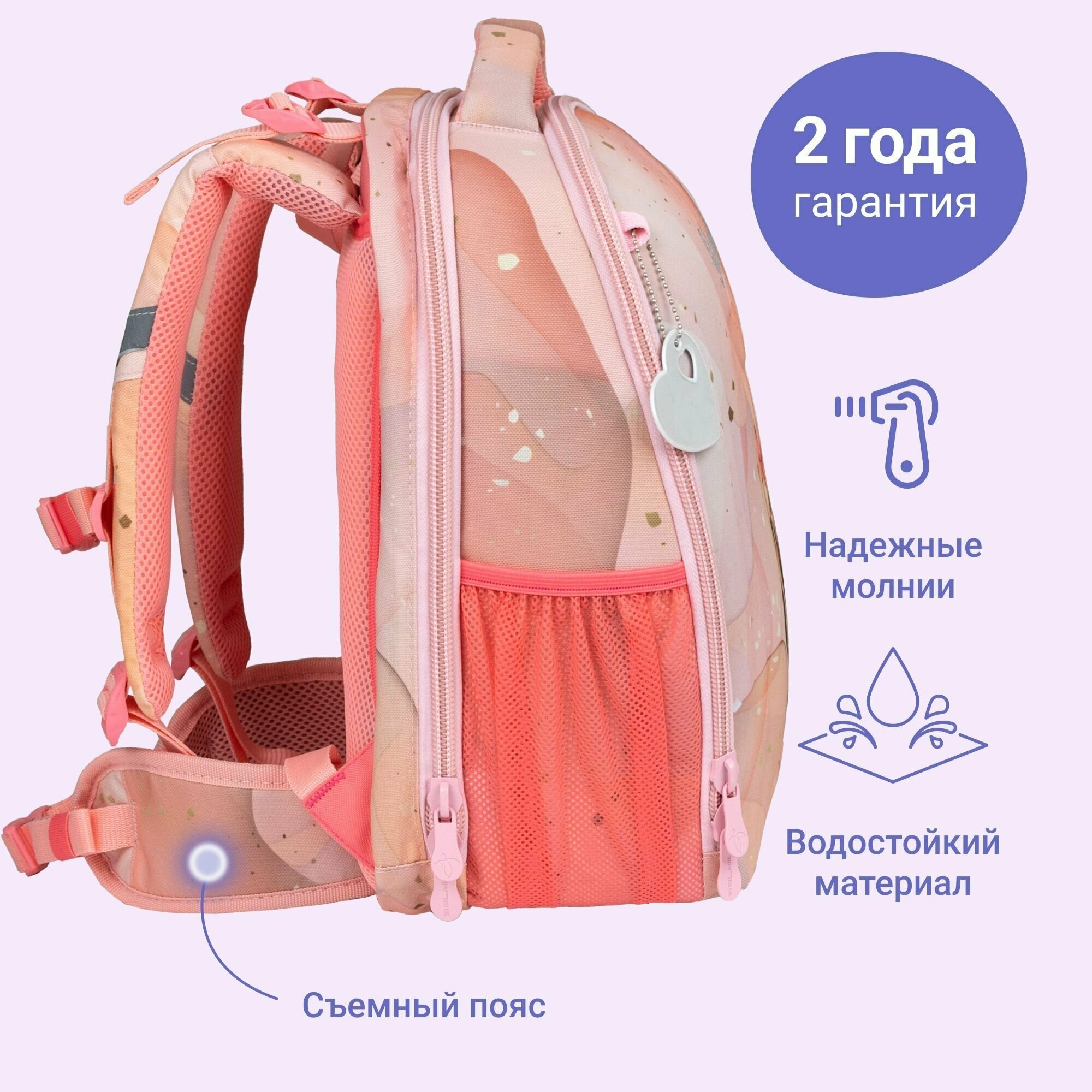 Ранец новой формы с жесткой передней панелью изготовлен из EVA-материала с повышенной износостойкостью. Материал верха ранца не промокает, не выгорает, не выцветает и легко моется губкой. Внутренняя подкладка устойчива к порезам и загрязнениям. Анатомическая спинка повторяет естественный изгиб позвоночника. Наплечные лямки регулируются на нужную длину. Нагрудный фиксирующий ремень. Удобная широкая эргономичная ручка для переноски с мягкой подкладкой. Съемный набедренный ремень. Два отделения на молнии, в которых легко поместятся тетради, учебники и альбомы формата А4. В основном отделении расположен органайзер с несколькими отсеками для канцелярии, специальный мягкий карман для мобильного телефона и карман для ключей. Два боковых кармана на утяжке. Подходит для бутылки воды, сока или зонтика. Уплотненное дно с пластиковыми ножками.