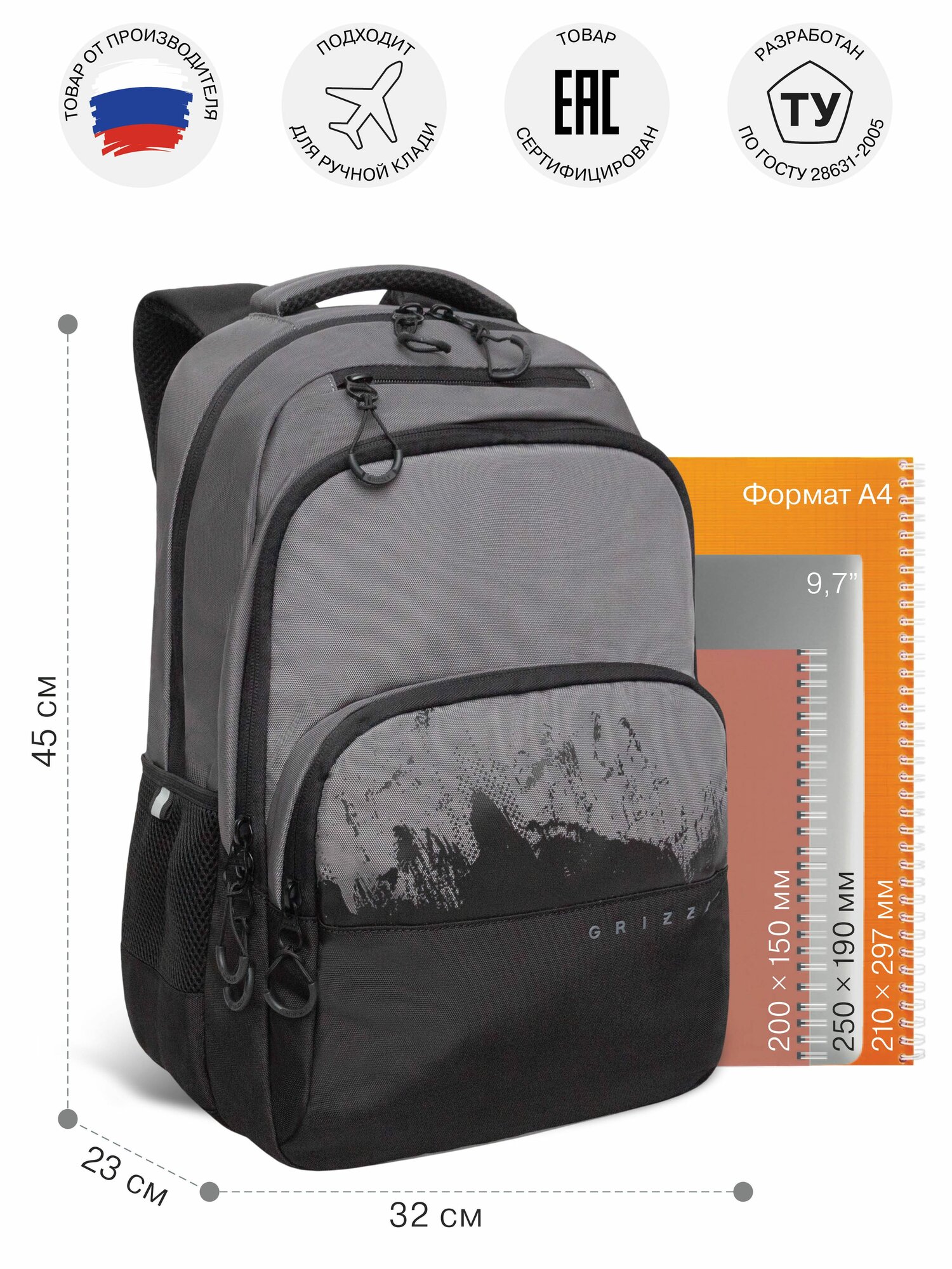 Эту серию рюкзаков GRIZZLY мы разработали для мальчиков старших классов. Они рассчитаны на рост от 150 см. Рюкзаки яркие и стильные — нравятся подросткам. Рюкзак сделан из плотного полиэстера и хорошо держит форму. Есть светоотражающие элементы. Все швы аккуратно прошиты, а где это нужно, усилены дополнительно. Допустимая нагрузка — 7 кг. Чтобы от такого веса не пострадала осанка, мы сделали анатомическую спинку. Широкие лямки с нагрудной стяжкой со свистком снижают нагрузку на плечи. Несмотря на то, что подросткам приходится носить с собой много вещей, в школьный рюкзак они помещаются. Здесь есть два больших основных отделения для книг, тетрадей и документов формата А4. Много внутренних и внешних карманов, пенал, брелок для ключей, отделение быстрого доступа для документов и кошелька. Материал рюкзака с водо- и грязеотталкивающей пропиткой. Если рюкзак все же чем-то испачкался, мы рекомендуем ручную стирку в холодной воде. С уважением, команда GRIZZLY