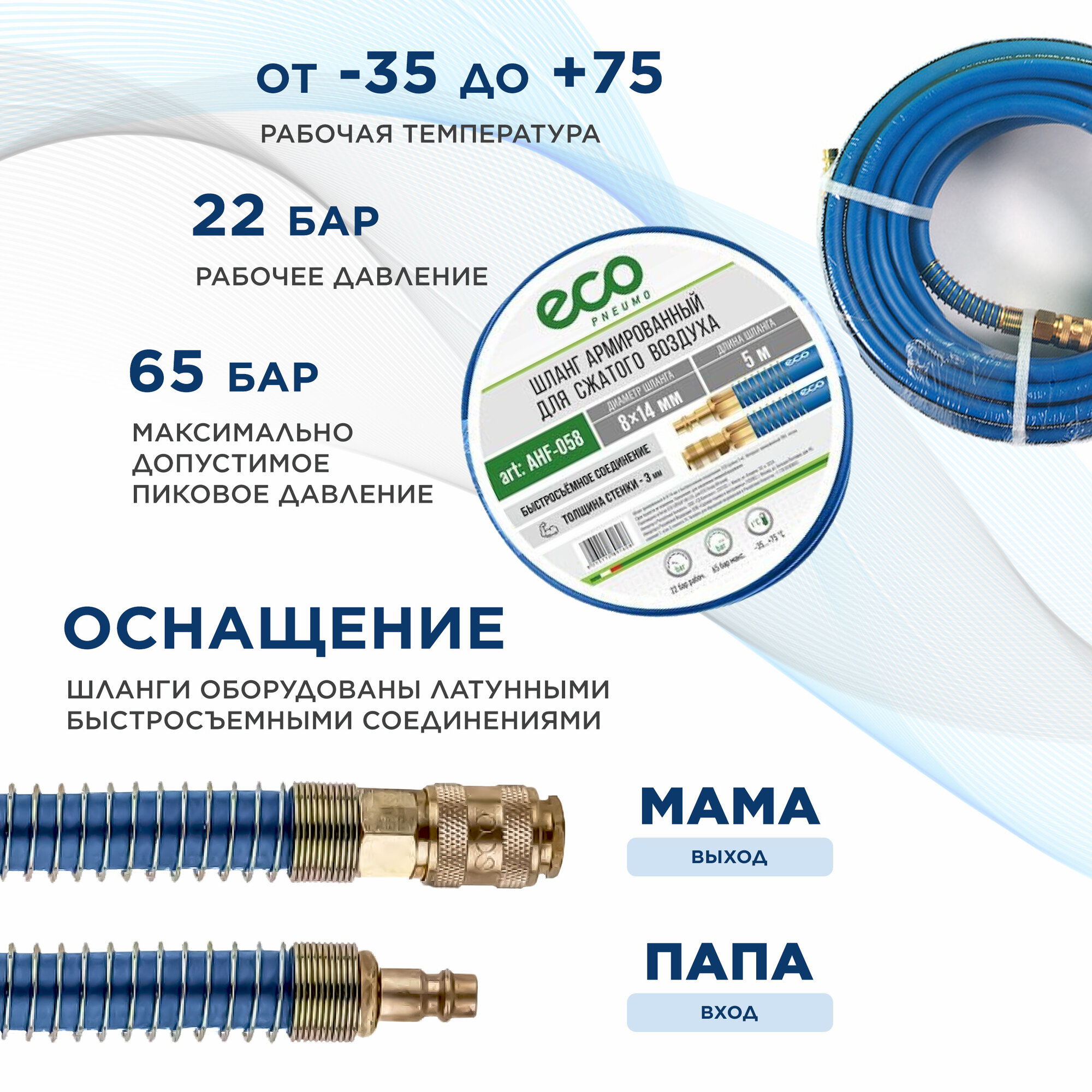 Купить Шланг для компрессора быстросъемный 5 м 8/14 мм армированный ECO AHF-058 с доставкой по всей России. Шланг для компрессора быстросъемный 5 м 8/14 мм армированный ECO AHF-058: сравнение цен, характеристики, фото, актуальное наличие и цены.