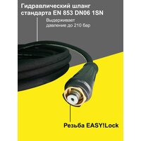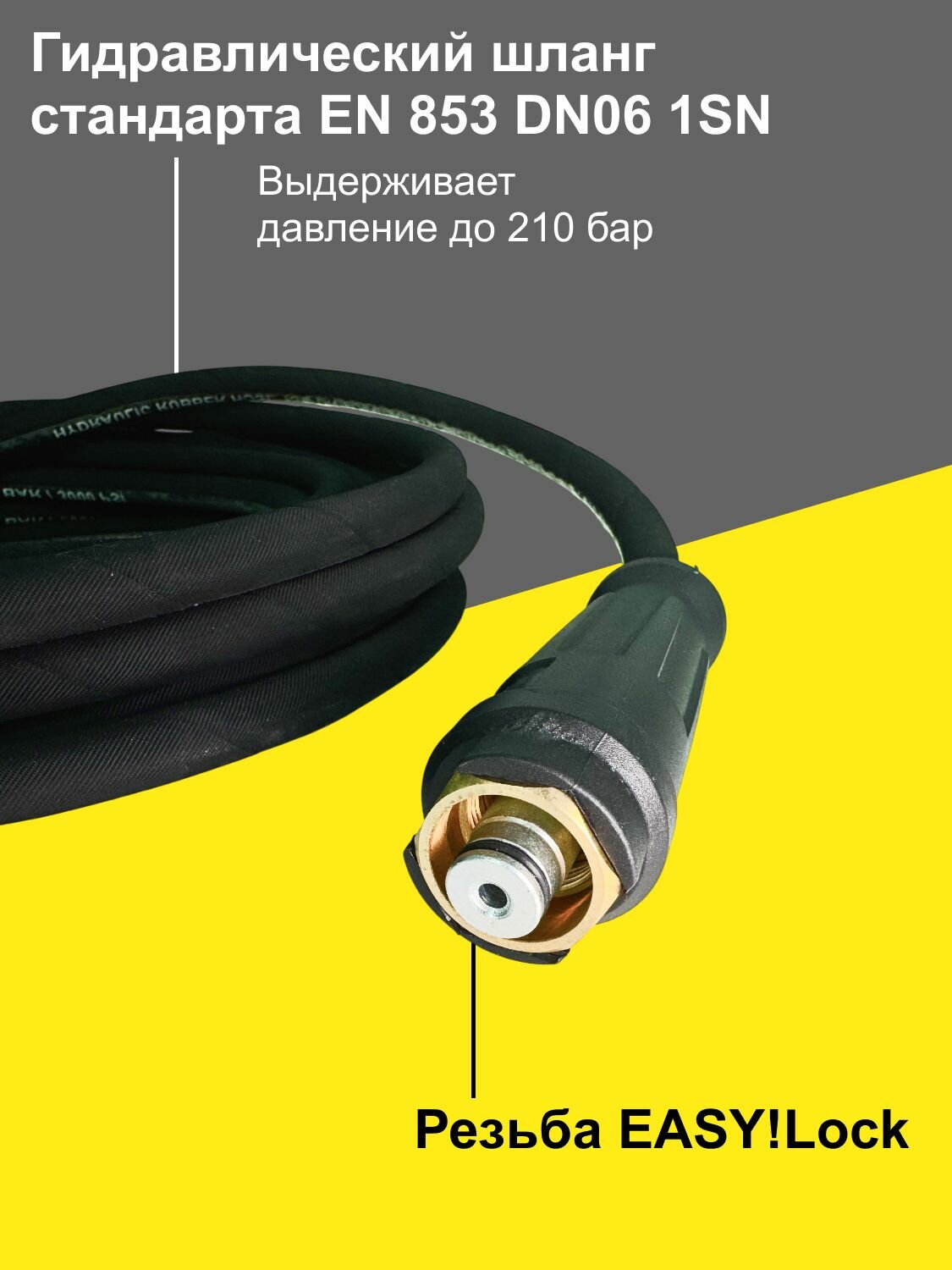 Шланг высокого давления для мойки (гайка EASY! Lock) Шланг высокого давления для KARCHER HD выполнен из гидравлического шланга стандарта EN 853 DN06 1SN. Внутренний диаметр 6 мм, Гидравлический шланг изготовлен из двухслойной резины с металлической двухслойной оплеткой. Рабочее давление 200 / 400 бар. Длина - 10 метров. Подключение: штуцер EASY! Lock с обоих концов