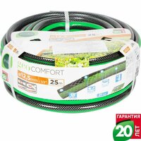 Шланг имеет длину 25 метров и диаметр 1/2", что обеспечивает его гибкость и удобство использования. Материал изготовления – ПВХ (поливинилхлорид), который отличается прочностью и долговечностью.