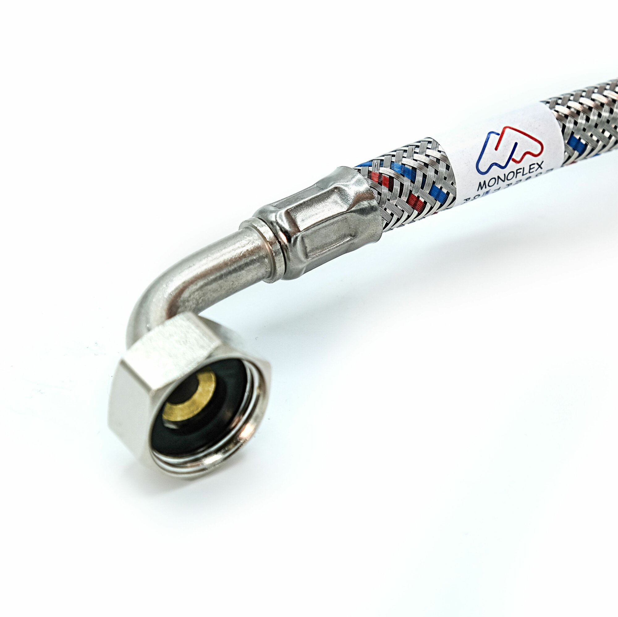 Заливные шланги Monoflex в оплетке из нержавеющей стали, являются более надежным и долговечным подключением для стиральных и посудомоечных машин, а также холодильников с льдогенератором в качестве заливного шланга. Вкрапления красных и синих нейлоновых нитей, характеризуют горячее и холодное водоснабжение. Фитинги латунные.