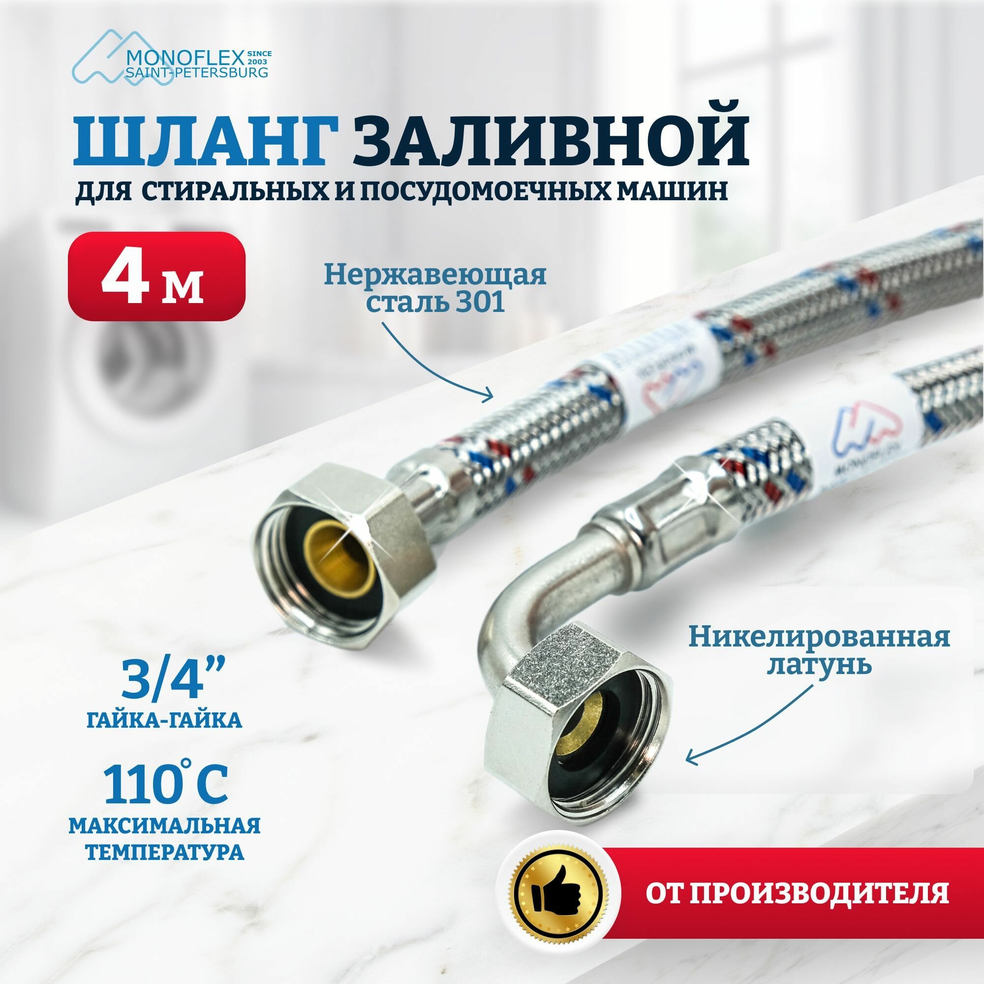 Купить Шланг для стиральной машины заливной 4м (400см) MONOFLEX, гайка 3/4″, в металлической оплетке, 1шт/уп с доставкой по всей России. Шланг для стиральной машины заливной 4м (400см) MONOFLEX, гайка 3/4″, в металлической оплетке, 1шт/уп: сравнение цен, характеристики, фото, актуальное наличие и цены.