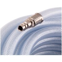 Шланг пневматический армированный прозрачный Stels 57027 из ПВХ, диаметром 10 х 16 мм и длиной 30 м, с быстросъемными соединениями, выдерживает давление до 18 бар. Предназначен для соединения между собой мощных компрессоров и инструментов с пневматическим приводом, а также прокладки магистральной пневмолинии. Шланг подойдет для использования на производственном предприятии, строительной площадке или в автосервисе. Преимущества Качественное исполнение — шланг изготовлен из ПВХ и имеет армирующий слой из полиамида, поэтому характеризуется высокой прочностью и устойчивостью к падениям и пережатиям, а также невосприимчивостью к химическим воздействиям. Долговечность — антикоррозийное никелевое покрытие защищает стальные штуцер и муфту от разрушения, рукав увеличенной толщины отличается высокой прочностью. Быстрая подготовка к работе — соединения типа «рапид» упрощают подключение шланга к компрессору и пневматическим инструментам. Комфортная работа — шланг длиной 30 м позволяет мастеру беспрепятственно перемещаться по рабочей зоне.