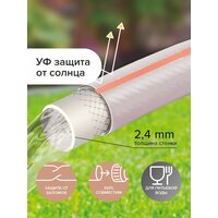 Шланг для полива Polyagro серии "Жемчуг" - резиновый, армированный, внутренний диаметр 1/2" (12 мм), внешний диаметр 16,8 мм, длина 25 м. Поливочный шланг изготовлен из термоэластопласта - аналога резины с улучшенными характеристиками. При этом он обладает высокой прочностью и гибкостью. Шланг садовый устойчив к перепаду температур. Его можно использовать не только для полива, но и для организации питьевого водоснабжения и перекачки пищевых жидкостей. Шланг для питьевой воды - трехслойный, армирован синтетической нитью. Толщина стенки 2,4 мм. Рабочее давление шланга 10 бар. Температурный режим -50 до +90 °С. Защита от ультрафиолета. Долговечный. Защита от заломов: не заламывается и не перекручивается. Шланг переливается, словно Жемчуг, благодаря добавления в краску уникального минерала «Анатаз». Вес 3440 кг.