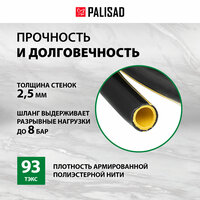 Шланг поливочный армированный 3-слойный ТЭП (термоэластопласт) Palisad 67110 диаметром 1/2″ и длиной 20 м, аграрный, пригодится владельцам дачных участков и сотрудникам коммунальных служб для создания системы орошения. Он облегчает труд пользователя, позволяя быстро восполнять водный баланс почвы. Длины 20 м достаточно для орошения небольших участков. ПреимуществаПрочность и долговечность — шланг из ТЭП, армированный суперпрочной полиэстерной нитью плотностью 93 тэкс, устойчив к повышенным нагрузкам на изгиб, скручиваниям и обладает высокой морозоустойчивостью. Высокий ресурс — армирующая нить с инновационным плетением обеспечивает равномерное распределение нагрузки. Всепогодность — температурный диапазон эксплуатации от -30 до +70°С. Устойчивость к УФ-лучам и механическим воздействиям — на поверхность шланга нанесено защитное покрытие. Высокие эксплуатационные характеристики — толщина стенок составляет 2,5 мм, поэтому шланг выдерживает разрывные нагрузки до 8 бар. Экологичность — термоэластопласт и армирующая нить не содержат вредных веществ.