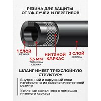 Шланг имеет трехслойную структуру: внутренний и наружный слои изготовлены из высококачественной резины, усиление выполнено с помощью нитяного каркаса.