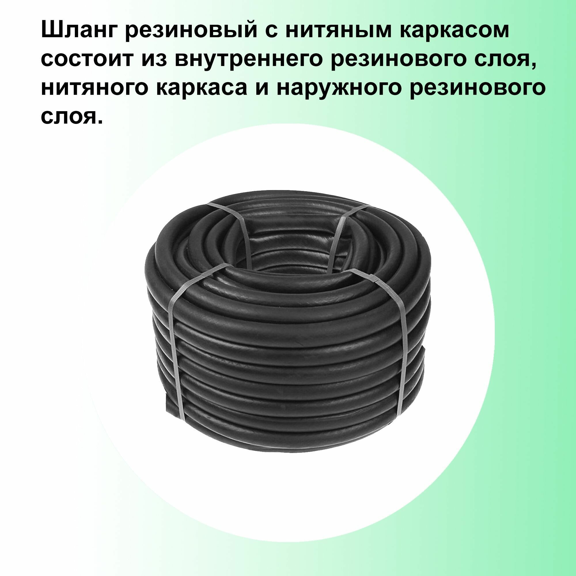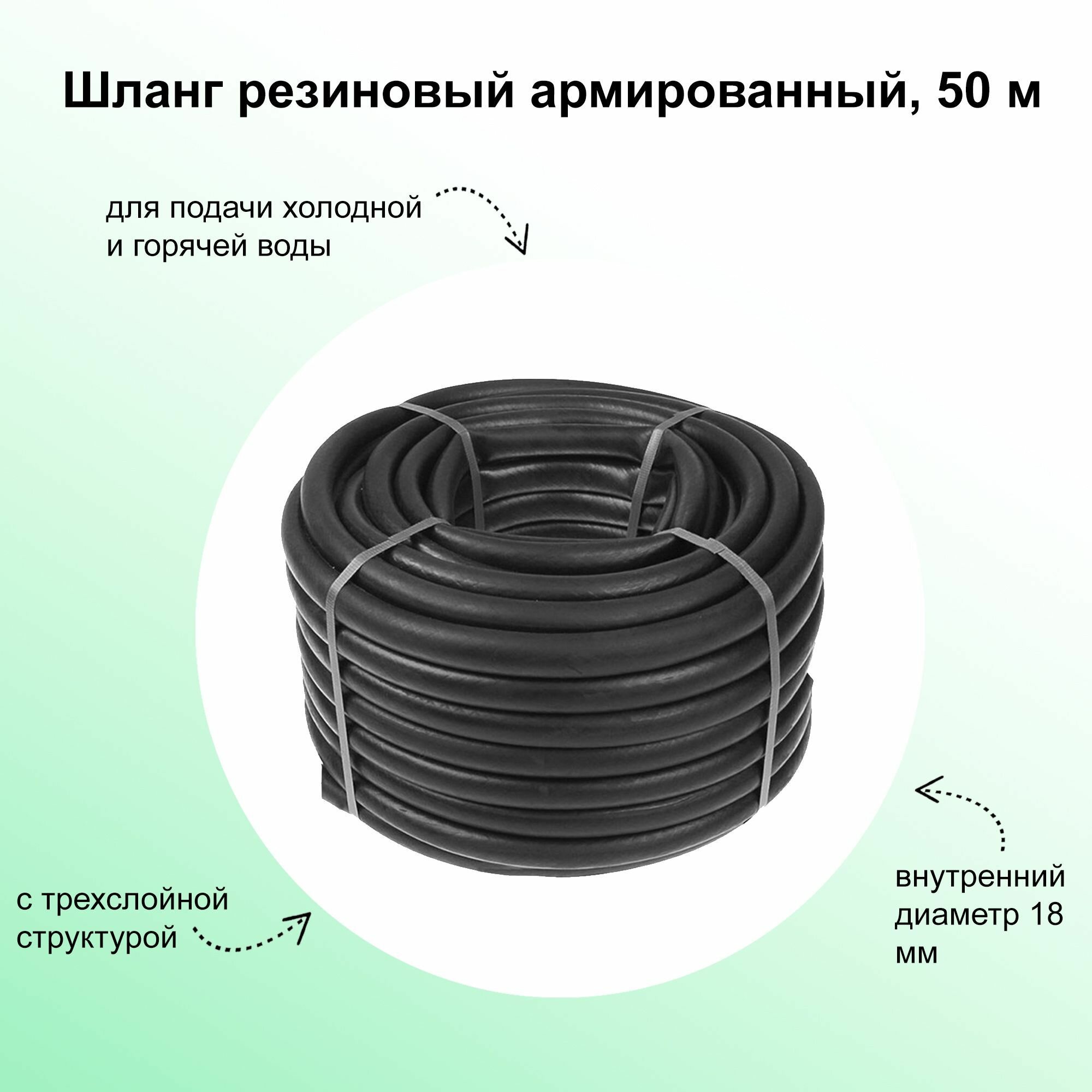Шланг резиновый армированный 50 м, прочный, с трехслойной структурой - для подачи холодной и горячей воды. Внутренний диаметр 18 мм.