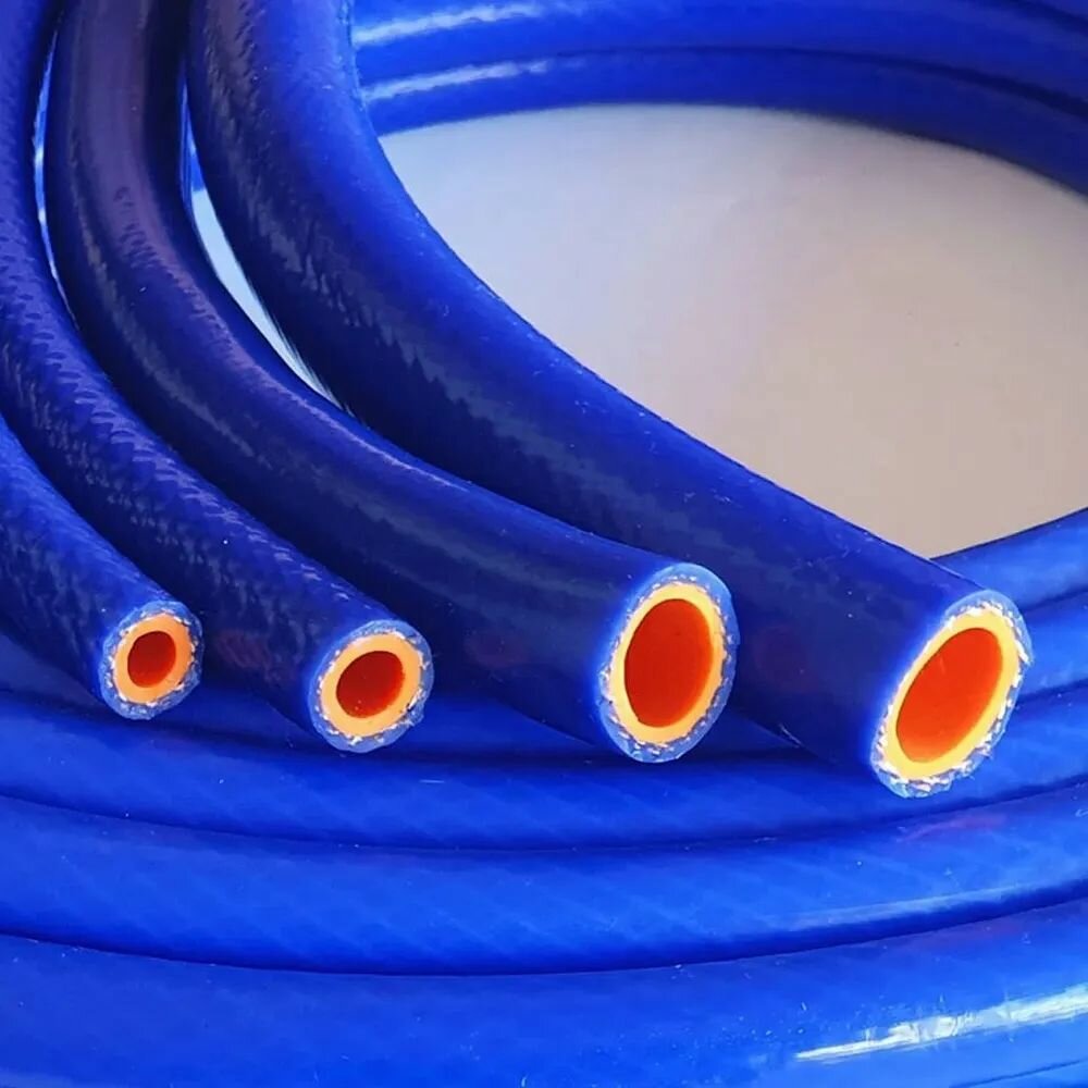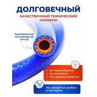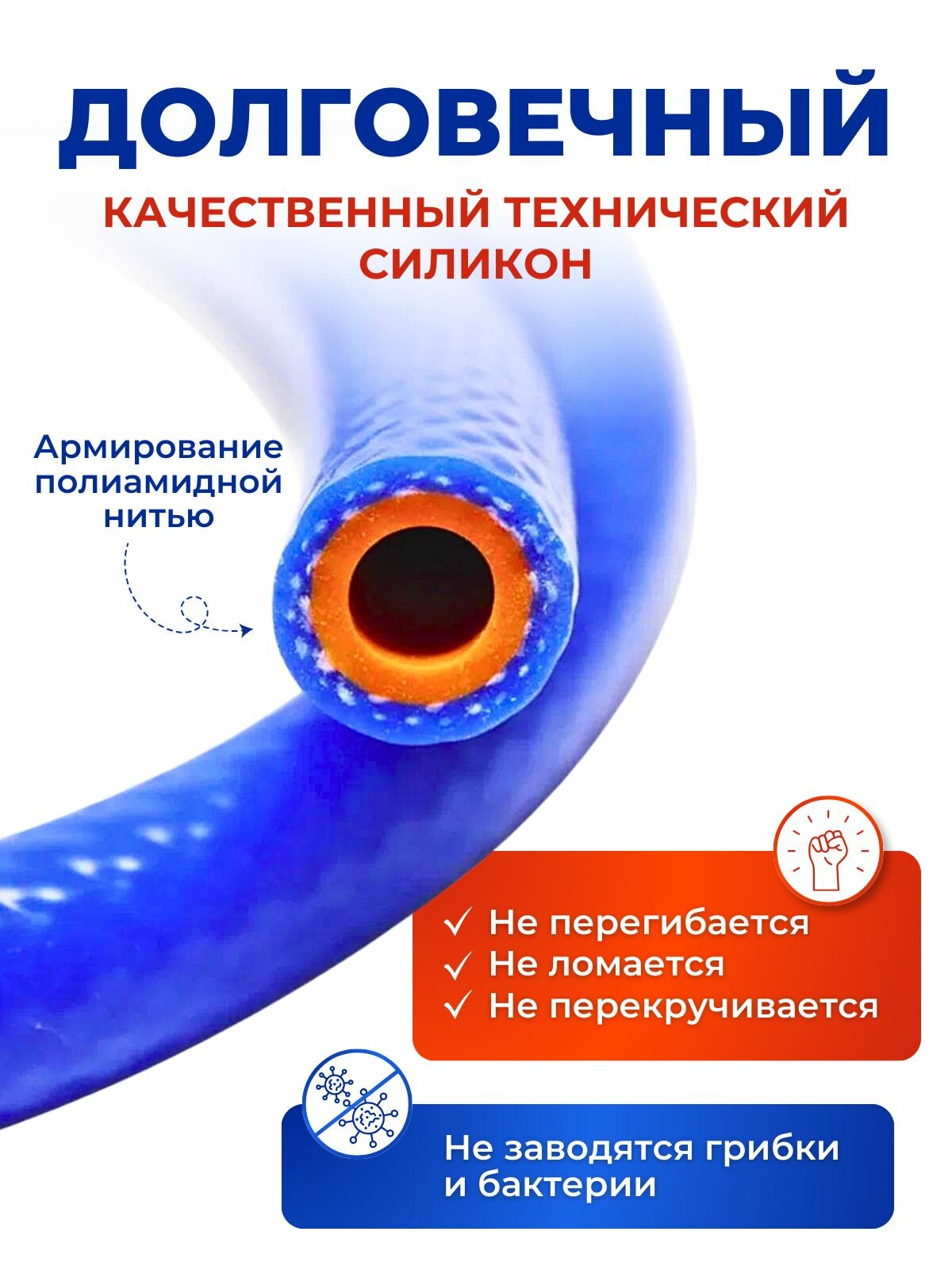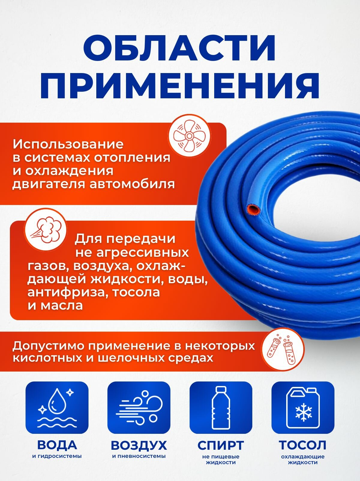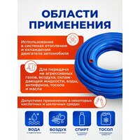 Шланг силиконовый армированный высокотемпературный автомобильный. Применяется в автомобилестроении, промышленности, сельском хозяйстве. Используется для транспортировки высокотемпературных технических жидкостей, тосола, антифриза. Шланг силиконовый 16мм для авто армированный для полива отопителя радиатора печки представляет собой трехслойную конструкцию: первый внутренний силиконовый слой - нитяное усиление (каркас) - наружный силиконовый слой. Шланг силиконовый армированный – надежный и долговечный помощник в бытовых и промышленных нуждах, а также в автомобильной отрасли. Силиконовый рукав изготовлен из высококачественного силикона, который обеспечивает отличную гибкость и устойчивость к повреждениям. Силикон, из которого изготовлен внутренний и внешний слои шланга, выдерживает высокое давление и температуру. Рабочая t от -50 до +250 градусов. Рабочее давление 5-10 атм (0,5-1,0 Мпа). Силиконовый шланг - незаменимый аксессуар для вашего автомобиля. Этот универсальный шланг предназначен для систем отопления, охлаждения двигателя и передачи воздуха. Он идеально подходит для перекачивания неагрессивных газов, охлаждающей жидкости, антифриза, тосола, холодной и горячей воды, а также воздуха с небольшим количеством масляного тумана. Категорически нельзя использовать с бензином, топливом, тормозными жидкостями. Рукав силиконовый синий обладает высокой прочностью и устойчивостью к повреждениям, что гарантирует его долгий срок службы. Кроме того, его гибкость и эластичность позволяют легко монтировать и подключать к различным системам автомобиля. Силиконовый рукав идеально подходит для использования в садах и огородах. Он устойчив к воздействию ультрафиолетовых лучей и химических веществ, что делает его незаменимым инструментом для полива растений. Шланг для сада легко гнется и принимает необходимую форму, что существенно упрощает его использование.