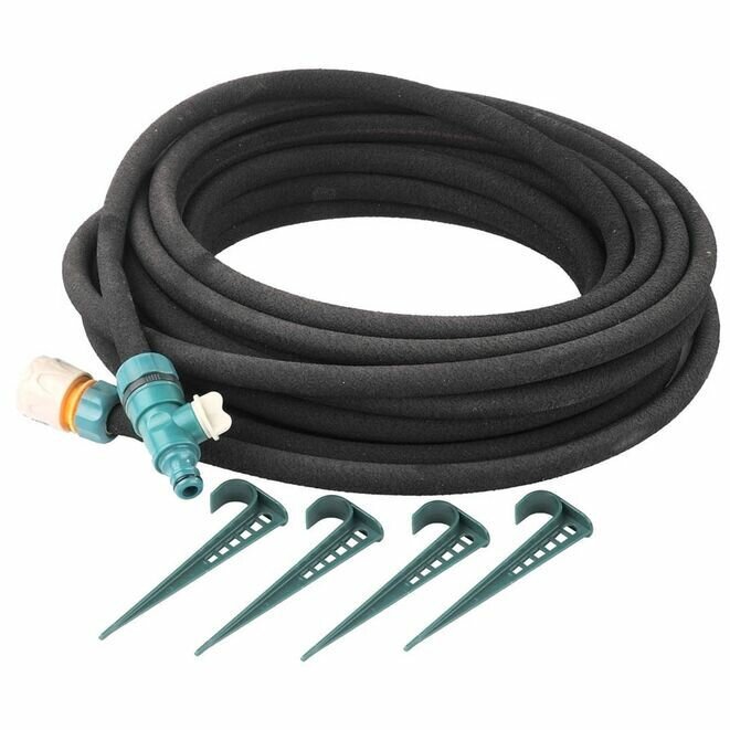 Шланг - 1 бухта (15 м). Соединитель - 1 шт. Клапан - 1 шт. Колышки - 6 шт.