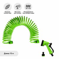 Шланг спиральный, L = 15 м, распылитель 5 режимов, коннектор 2 шт, штуцер d = 1/2" (12 мм) – 3/4" (19 мм), зелёный