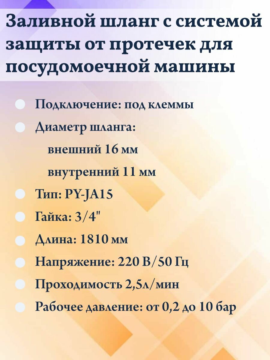 С высококачественными материалами, из которых изготовлен шланг, вы можете быть уверены в его долговечности и надежности. Этот заливной шланг будет отличным выбором как для стиральной, так и для посудомоечной машины. Особая система аквастоп защитит вашу технику и помещение от возможных проблем с водой, гарантируя полное спокойствие при использовании. Независимо от типа вашего устройства, этот шланг станет отличным решением, обеспечивающим стабильную подачу воды.