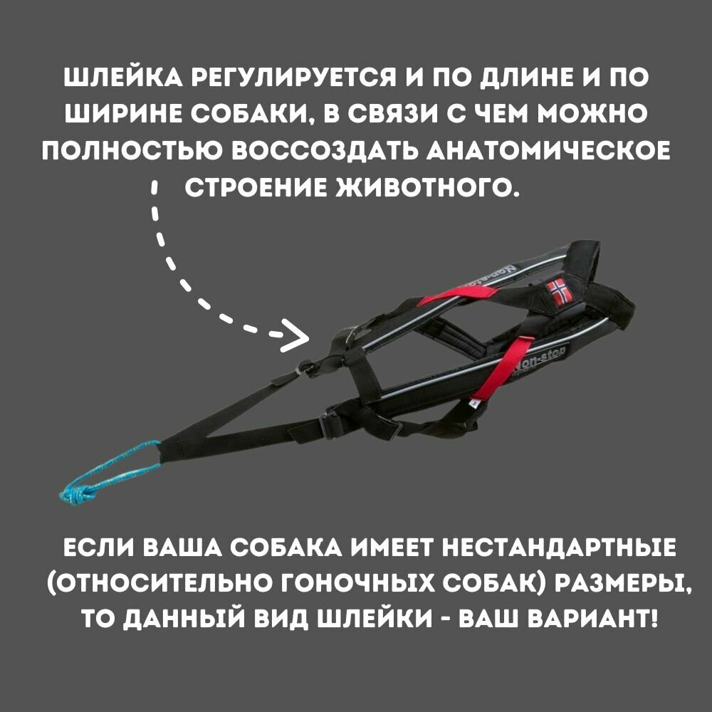 Шлейка Нон-стоп изготовлена из высокопрочных материалов, которые не повреждают и не вытирают шерсть собакам. Шлейка регулируется и по длине и по ширине собаки, в связи с чем можно полностью воссоздать анатомическое строение животного. Если ваша собака имеет нестандартные (относительно лайко-подобных собак) размеры, то данный вид шлейки - ваш вариант!