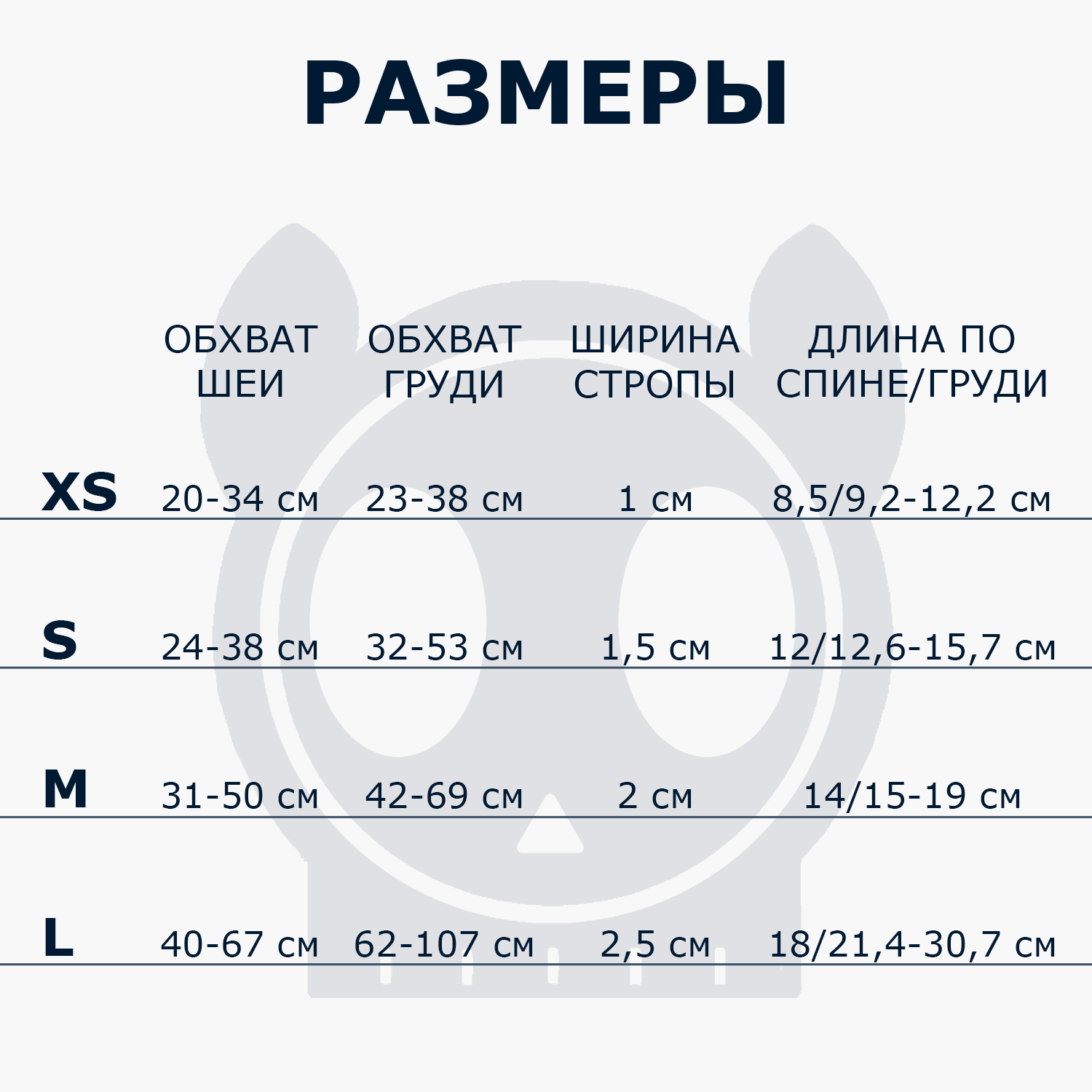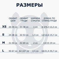 XS — обхват шеи 20 - 34 см | обхват под лапами 23 - 38 см | длина по спине 8,5 см | длина по груди 9,2-12,2 см | ширина стропы 1 см | вес 38 гр