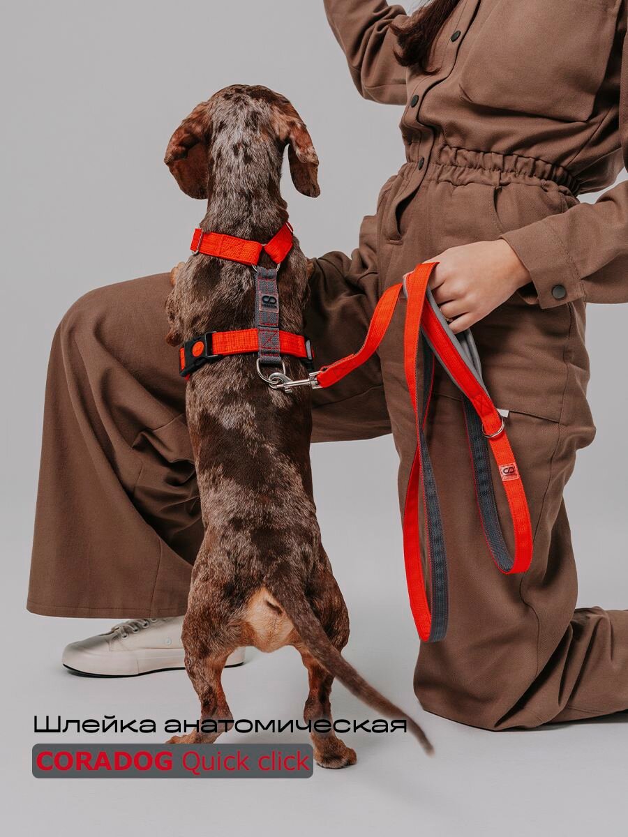 Удобная и легкая шлейка CORADOG Quick click правильной анатомической формы не сковывает движений собаки, не вызывает дискомфорта. Спереди имеет Y-образную форму, которая защищает шею собаки от натяжения поводка и не травмирует ее. Лямки шлейки на обхвате груди отходят от плеча, чтобы не натирать подмышки и не мешать во время движения. Пять точек регулировки позволяют максимально точно отрегулировать размер на собаке. Фиксация лямки на животе и плотная спинка значительно снижают вероятность перекручивания шлейки. Модель шлейки учитывает особенности маленьких, средних и крупных собак. Рассчитана на рывки и высокие нагрузки.