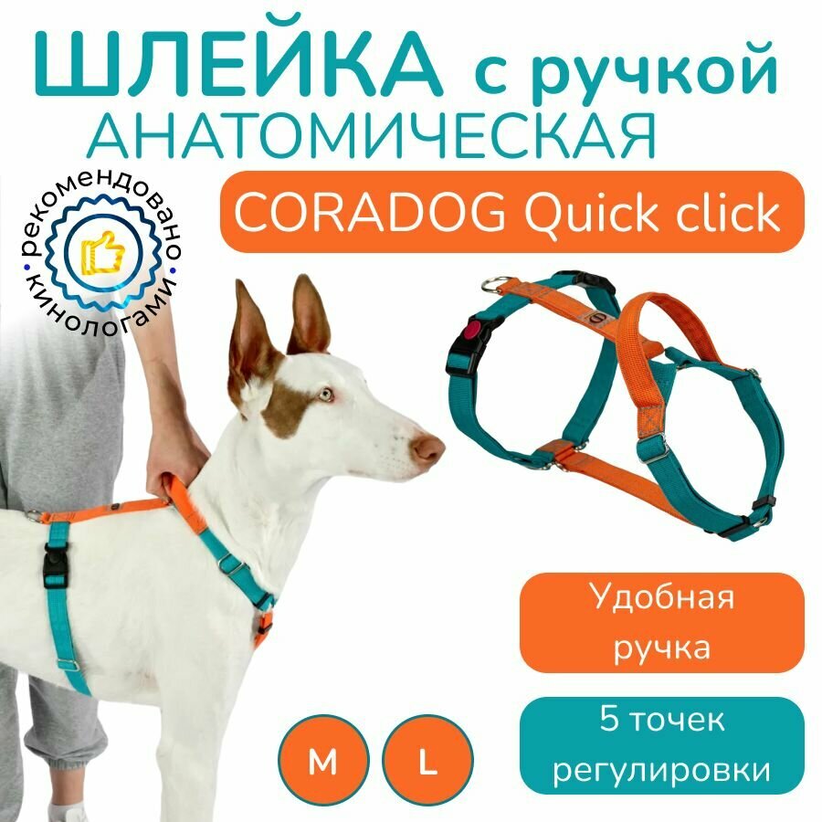Шлейка с ручкой прогулочная анатомическая для средних и крупных пород собак, CORADOG Quick click, размер M, цвет бирюзовый, оранжевый: сравнение цен, характеристики, фото, актуальное наличие и цены.