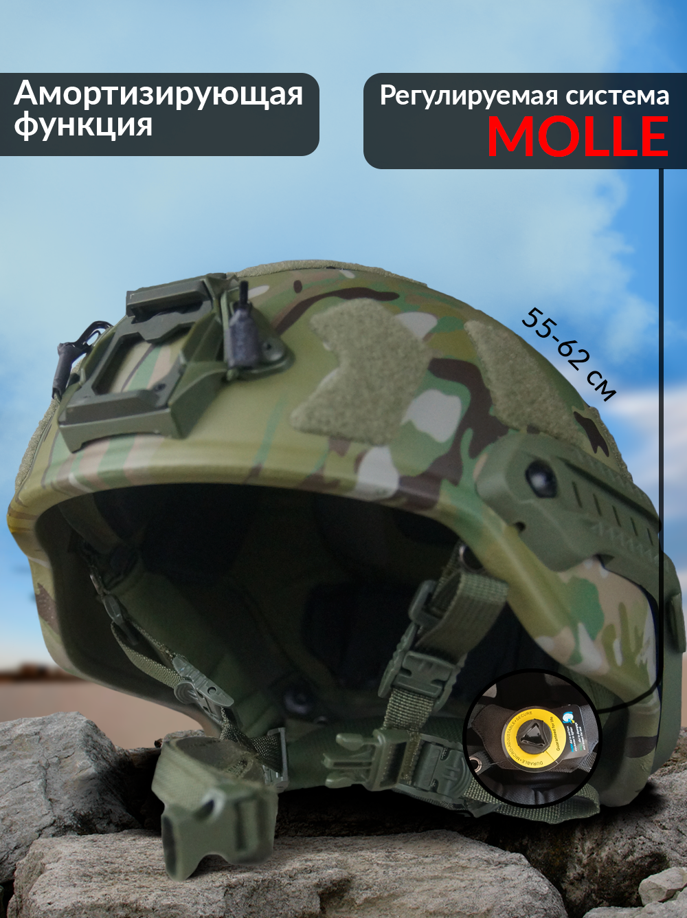 Шлем БР 2 Mich 2000 – современный и надежный боевой шлем для СВО. Размер универсальный, подойдет для любого типа головы, благодаря удобной системе Team Wendy. Материал шлема – Арамид, один из самых прочных композитных материалов в мире. Вес шлема – 1.85 кг. Шлем проходил отстрел и имеет сертификат качества. Корпус баллистической тактической каски имеет уникальную форму со сверхвысоким вырезом. Облегченный модульный банджи-кожух минимизирует опасность зацепления и помех. Каркасные рельсы облегчают установку дополнительного оборудования, снижая общий вес шлема до 30% в сравнении с металлическими рельсами. Благодаря крючковым зажимам можно дополнять бронешлем нашлемными аксессуарами: наушниками, прибором ночного видения, очками, инфракрасной камерой. Высокий вырез позволяет надевать под шлем противогаз, устанавливать большие гарнитуры. Внутри шлема имеются мягкие, но плотные вставки из вспененного полипропилена, которые выполняют функции поглощения ударов. Для фиксации тактического шлема на голове предусмотрены ремешковые крепления, регулируемые с помощью пряжек и застяжек. Военный шлем Мич 2000 идеально подойдет для боевой экипировки солдата – Ратник.