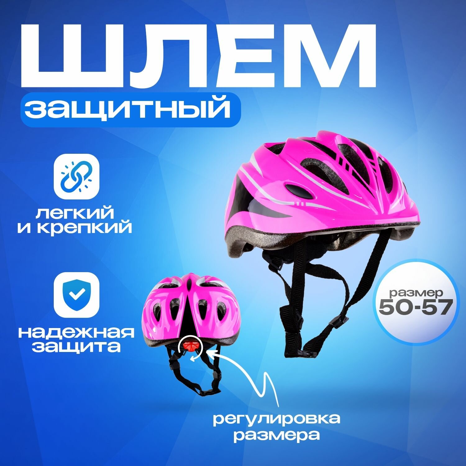 Легкий и комфортный шлем защитит спортсмена от неожиданных падений при катании на роликовых коньках, скейтбордах, велосипедах, самокатах. Изготовлен из плотного пенополистерола с верхним покрытием из пластика. Имеет вентиляционные отверстия. Благодаря механизму регулировки размер шлема легко изме.