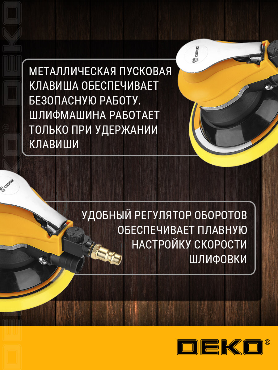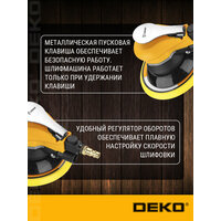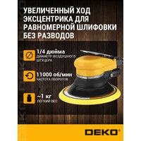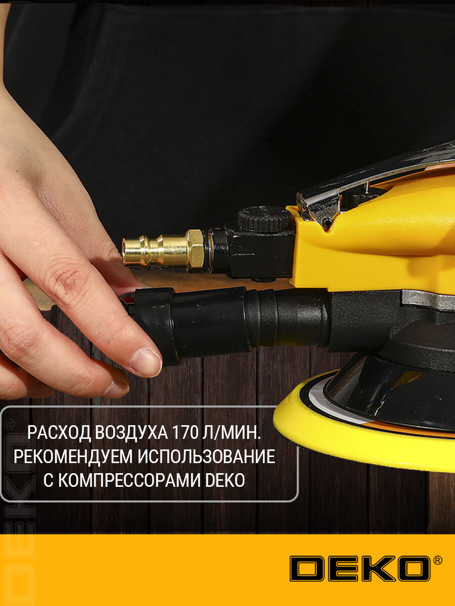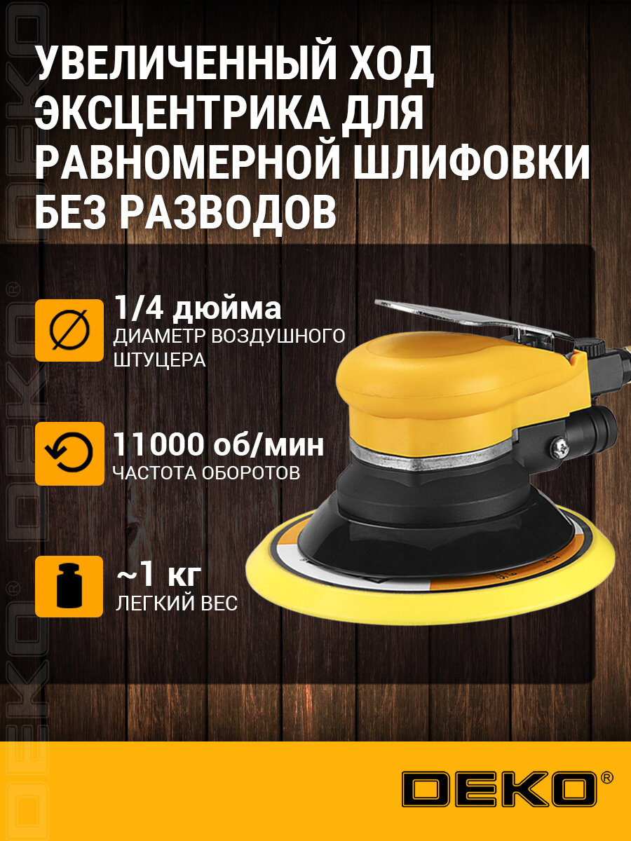 Шлифмашина DEKO DKOS150, пневматическая, орбитальная, желтая, 150мм, 11000об/мин: сравнение цен, характеристики, фото, актуальное наличие и цены.