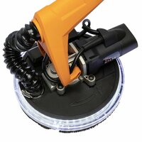 Уплотнение из синтетической щетки по периметру платформы образует барьер для строительной пыли, не давая ей выйти за его пределы. Отходы обработки, захваченные потоком воздуха от пылесоса, затягиваются через шланг и попадают в бак пылесоса.