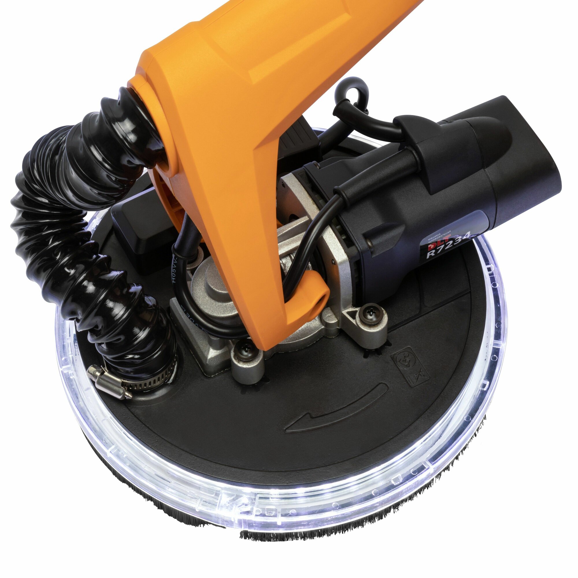 На шлифмашину для стен DLT R7234 установлен один из самых мощных, среди конкурирующих моделей, 710 ваттный электродвигатель. Регулировка скорости вращения регулируется колёсиком на рукоятке в диапазоне от 600 до 1500 оборотов в минуту. Это позволяет выбрать правильный режим в зависимости от размера абразива и плотности обрабатываемой поверхности. Также шлифмашина оснащена «плавным стартом».