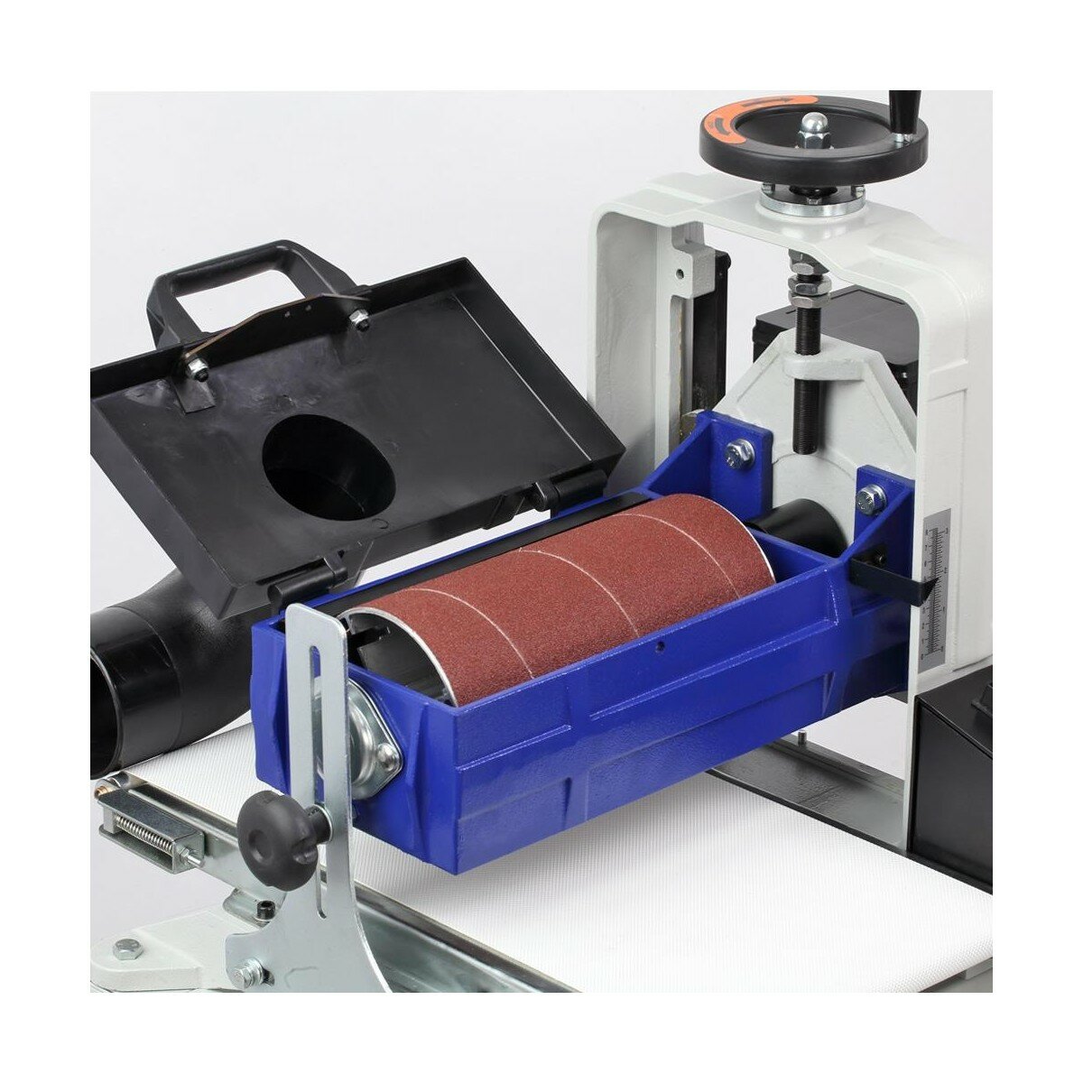 - Шлифовальный барабан имеет консольное расположение. При необходимости обработки более широких заготовок можно снять левую стойку и в два прохода обрабатывать детали шириной до 500 мм.