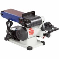 Корпус станка составной, основание из литого алюминия, имеются 2 патрубка для подключения систем аспирации. Широкое основание с противоскользящими накладками обеспечивает устойчивость на поверхности и снижает вибрации. Благодаря отверстиям есть возможность крепления к верстаку. Выключатель имеет специальный ключ. Ленточный блок поворотный, в зависимости от задач можно установить угол наклона от 0 до 90 град. Для удобства имеется рычаг быстрого натяжения и ослабления шлифовальной ленты. Абразивные материалы стандартные: лента – 915×102 мм, диск – Ø150 мм. На дисковый шлифовальный узел установлен алюминиевый рабочий стол с П-образным пазом для углового упора. Угол наклона стола от 0 до 45 град. Рабочий стол съемный, в зависимости от потребности его можно переставить на ленточный шлифовальный узел, установленный в вертикальном положении.