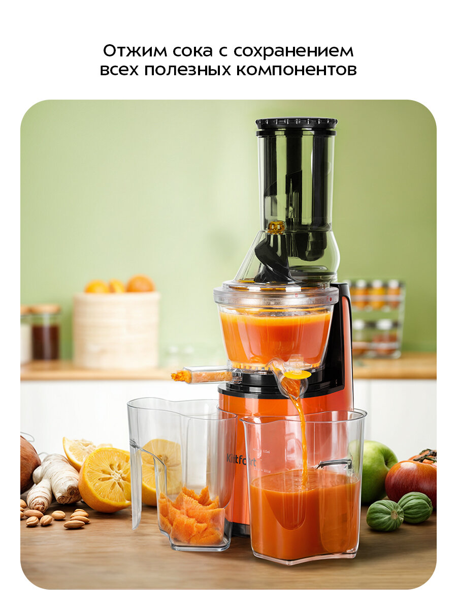 Благодаря использованию технологии низкоскоростного отжима, соковыжималка Kitfort KT-1102 позволяет получать сок практически из любых овощей и фруктов, орехов, зелени и даже пророщенной пшеницы. При этом сохраняется не только их вкус, цвет и аромат, но все микроэлементы и витамины. В шнековой соковыжималке сок почти не вспенивается, а время его контакта с воздухом минимально, поэтому сок не окисляется кислородом воздуха. Яркая, компактная и очень тихая Kitfort KT-1102 удобна в эксплуатации и не требует дополнительного места для хранения.