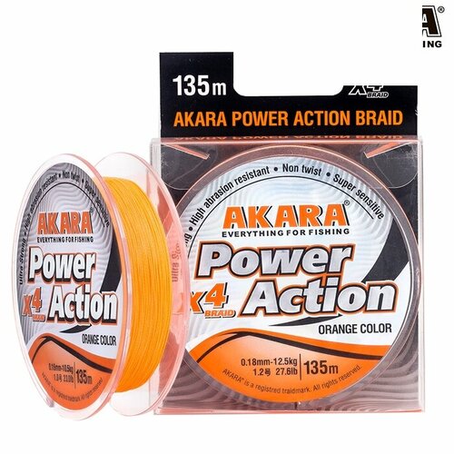 Power Action X-4 Orange 135 - универсальный плетёный четырехжильный рыболовный шнур, выпускаемый под торговой маркой Akara. Шнур создан для того, чтобы удовлетворить потребности рыболовов в качественном, надежном, прочном и недорогом шнуре. Шнур оранжевого цвета. Изготовлен из плотного волокна японского производства. Шнур отличается высокой прочностью и надежностью, имеет круглую форму, абразивоустойчив и подойдет практически для любых условий лова, в том числе для ловли в местах, где высока вероятность зацепов. Поставляется в намотках 135 метров. Диапазон диаметров от 0,06 до 0,2 мм при тесте от 4,3 до 15,1 кг. Шнур отличается высокой прочностью и надежностью, имеет круглую форму, абразивоустойчив и подойдет практически для любых условий лова, в что числе для ловли в местах, где высока вероятность зацепов. Поставляется в намотках 135 метров.