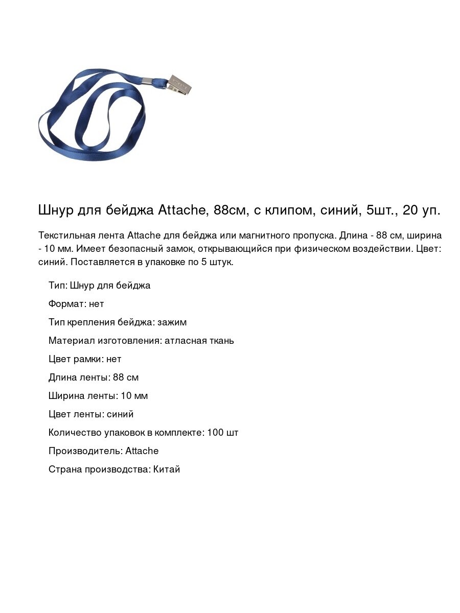 Купить Шнур для бейджа Attache, 88см, с клипом, синий, 5шт, 20 уп. с доставкой по всей России. Шнур для бейджа Attache, 88см, с клипом, синий, 5шт, 20 уп.: сравнение цен, характеристики, фото, актуальное наличие и цены.