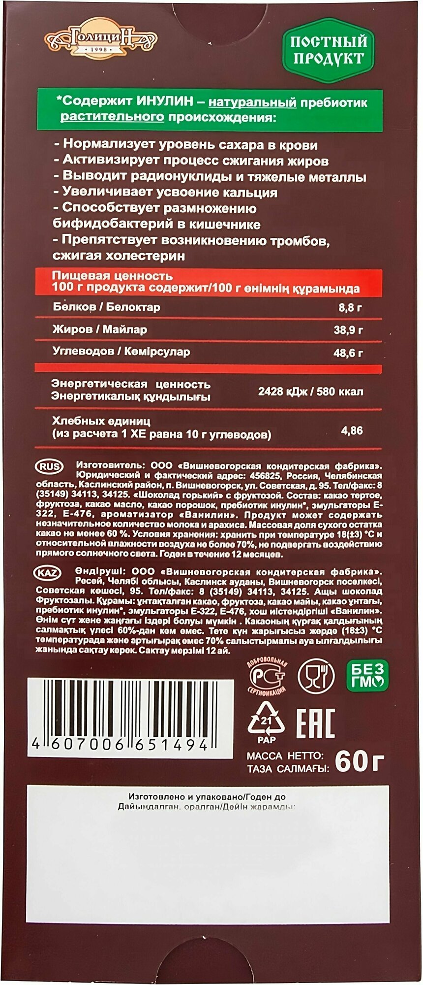 Купить Шоколад горький, «Голицин», 60% какао, без сахара, с фруктозой, 60г 5 шт с доставкой по всей России. Шоколад горький, «Голицин», 60% какао, без сахара, с фруктозой, 60г 5 шт: сравнение цен, характеристики, фото, актуальное наличие и цены.