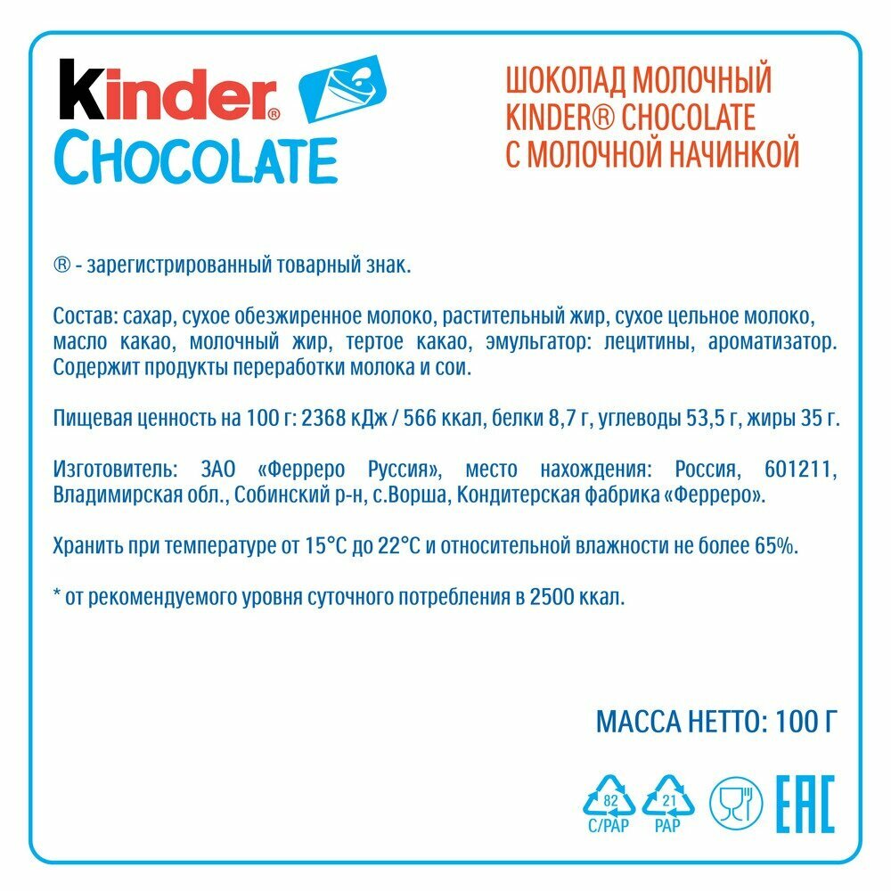 Шоколад Kinder изготовлен из качественного молочного шоколада, который обладает приятным и нежным вкусом. В составе шоколада используются только натуральные ингредиенты: сахар, сухое цельное молоко, масло какао, тертое какао и эмульгатор лецитины.