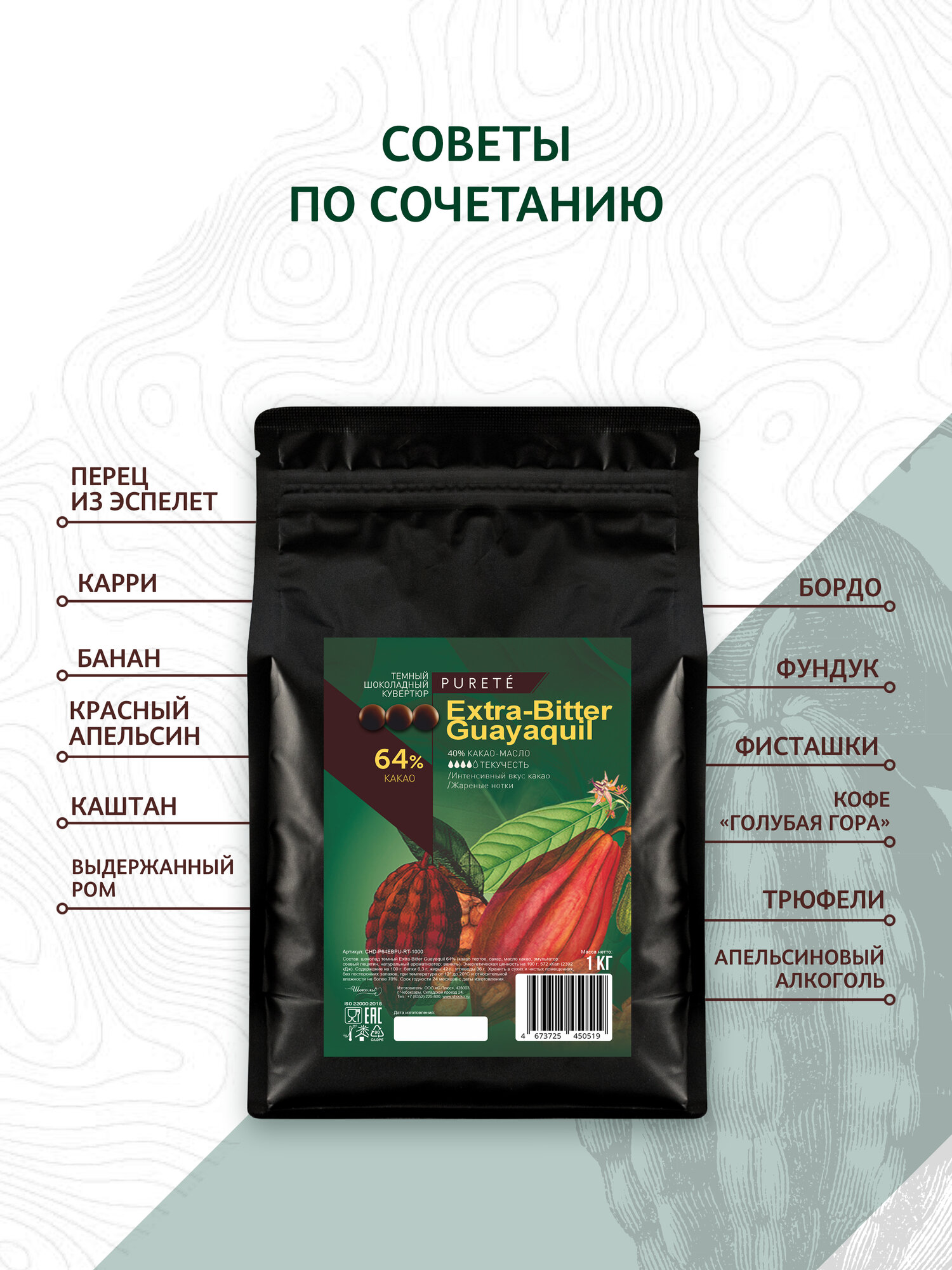 | Состав | какао тертое; сахар; масло какао; какао тертое (Эквадор); эмульгатор: соевый лецитин; натуральный ароматизатор: ваниль |