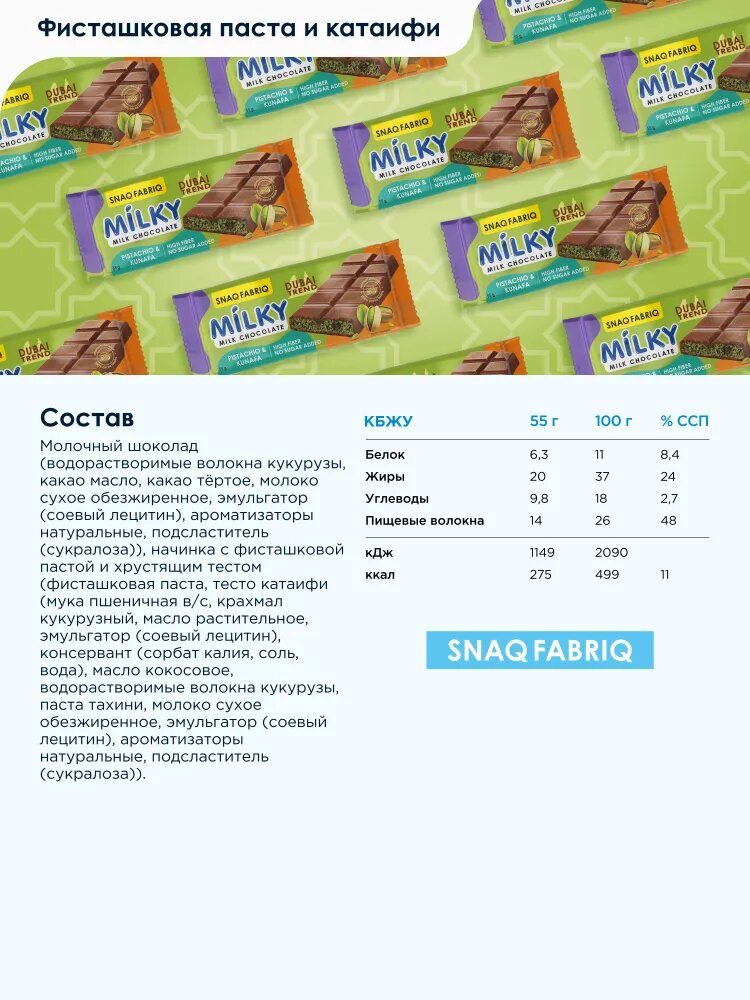 | Состав | молочный шоколад (водорастворимые волокна кукурузы, какао масло, какао тертое, молоко сухое обезжиренное, эмульгатор (соевый лецитин), ароматизаторы натуральные, подсластитель (сукралоза)), начинка с фисташковой пастой и хрустящим тестом (фисташковая паста, тесто катаифи (мука пшеничная в/с, крахмал кукурузный, масло растительное, эмульгатор (соевый лецитин), консервант (сорбат калия, соль, вода), масло кокосовое, водорастворимые волокна кукурузы, паста тахини, молоко сухое обезжиренное, эмульгатор (соевый лецитин), ароматизаторы натуральные, подсластитель (сукралоза)) |