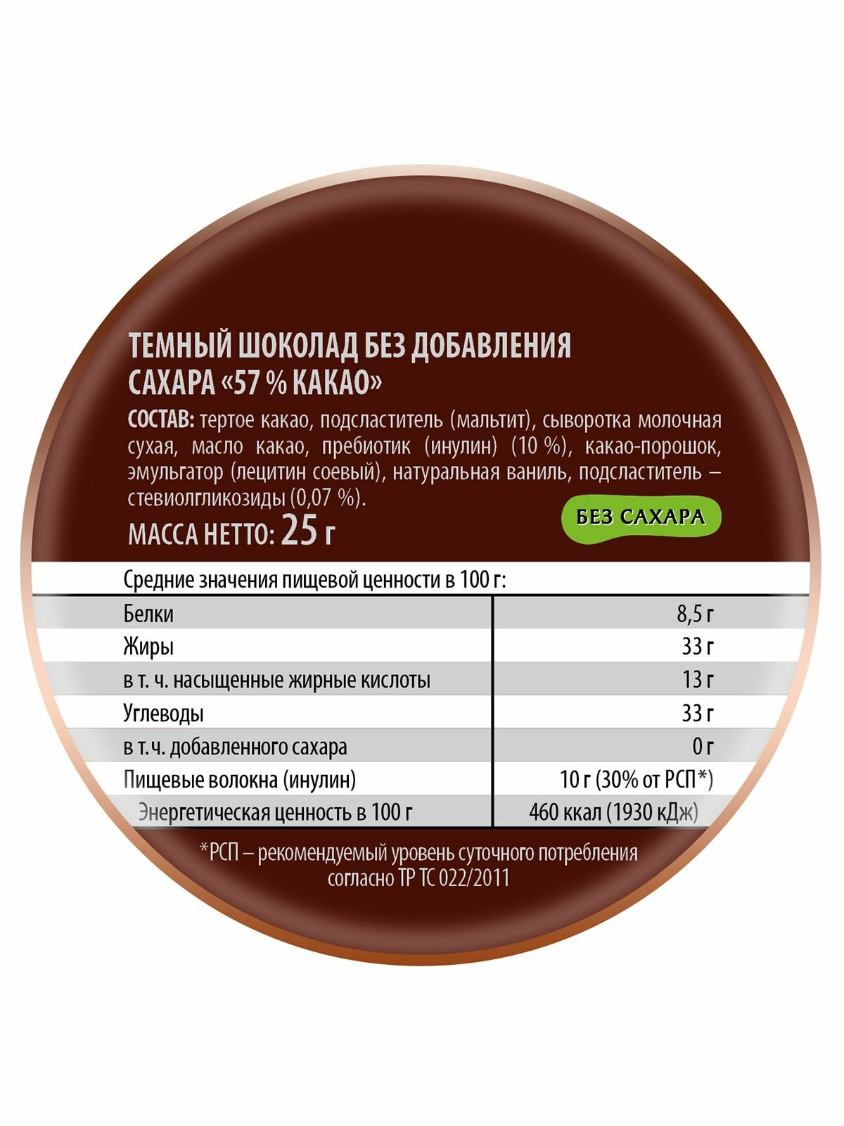 | Состав | тертое какао, подсластитель (мальтит), сыворотка молочная сухая, масло какао, пребиотик (инулин) (10%), какао-порошок, эмульгатор (лецитин соевый), натуральная ваниль, подсластитель - стевиолгликозиды (0,07%) |