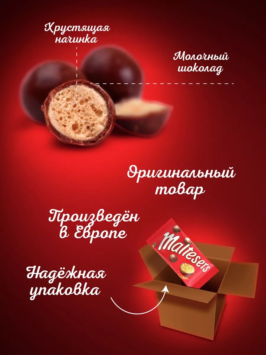 MADE IN NETHERLANDS. Почувствуйте оригинальный вкус неповторимого удовольствия с драже Maltesers! Maltesers - это хрустящие шарики, покрытые молочным шоколадом, которые просто тают во рту. Они так легки и нежны, что даже не тонут в воде. Это не просто шоколадные конфеты, это настоящее волшебство в каждом шарике. В каждой нашей упаковке Maltesers вы найдете 5 упаковок, каждая весом 37 граммов. Это идеальное угощение для вас и ваших близких, чтобы поделиться волшебством и радостью. Любимые вкусняшки для вас и ваших детей. Конфеты шоколадные мальтизерс подойдут в качестве подарка для ваших близких на любой праздник. Мало кто знает, что Maltesers - это традиционное шведское лакомство, которое представляют на Рождество. Эти шоколадные шарики были созданы компанией Mars Incorporated в 1937 году в Британии, и они завоевали сердца всех ценителей настоящего вкуса. Maltesers - это шарики, которые обладают уникальным вкусом и узнаваемой упаковкой. Они стали классикой, которая прославилась своим неповторимым вкусом и невероятной легкостью. Не упустите возможность попробовать этот истинный шедевр шоколада. Maltesers - легкий взгляд на шоколад, который доставит вам настоящее удовольствие! Остаточный срок годности товара всегда будет превышать 6 мес.
