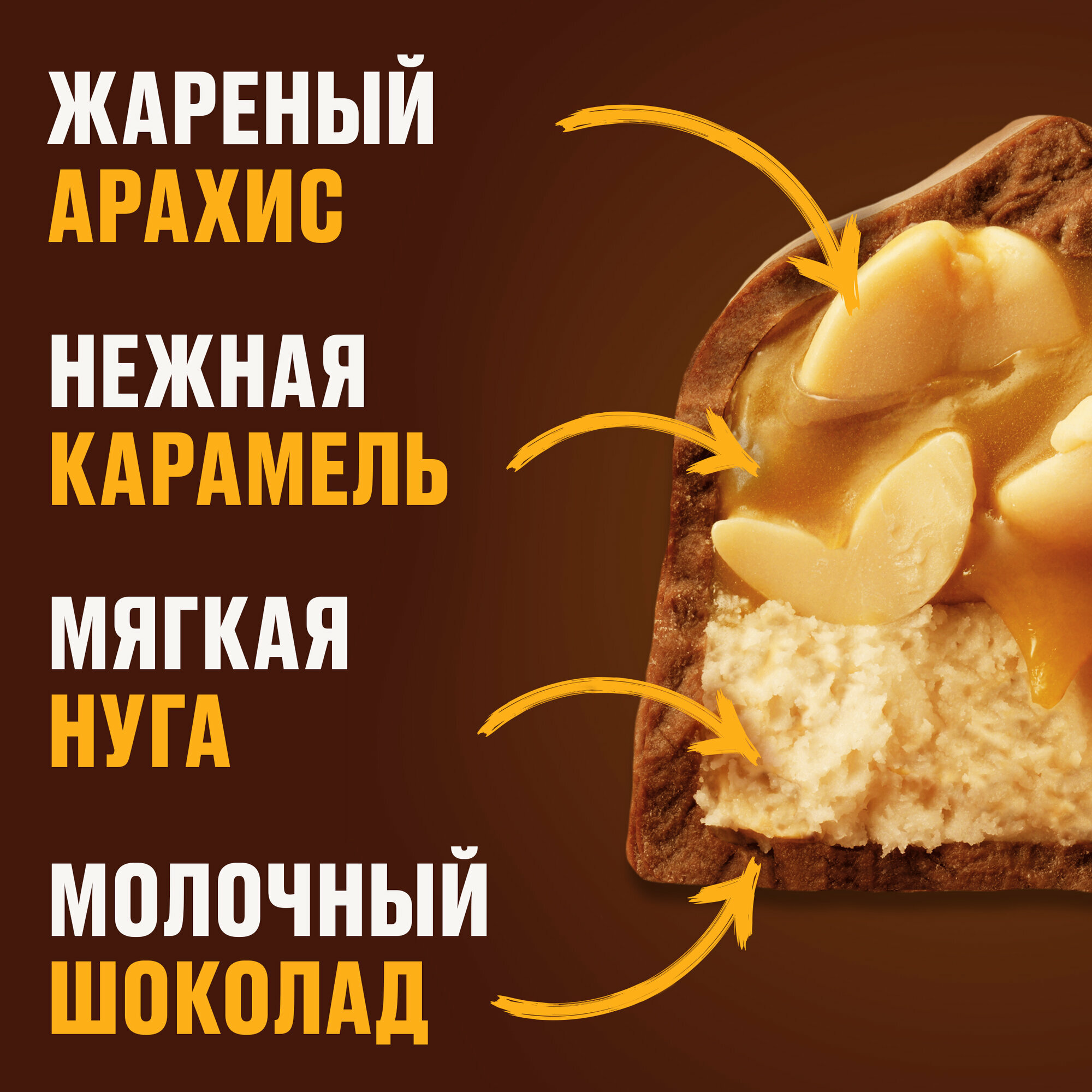 | Состав | молочный шоколад (сахар, какао масло, какао тертое, сухое обезжиренное молоко, сухой сывороточный пермеат (из молочного сырья), молочный жир, эмульгатор (соевый лецитин), эквивалент масла какао (масло пальмовое, масло ши)); глюкозный сироп (кукурузный, пшеничный), арахис, сахар, масло пальмовое рафинированное дезодорированное, сухое обезжиренное молоко, соль, сухой яичный белок. Содержит глютен. Может содержать незначительное количество фундука, миндаля. Средние значения пищевой ценности (100 г): белки – 8,1 г; жиры – 25 г; углеводы – 59 г. Энергетическая ценность (100 г): 494 ккал / 2068 кДж. Молочный шоколад содержит: общий сухой остаток какао – не менее 25 %; сухой обезжиренный остаток какао – не менее 2,5 %; сухой молочный остаток – не менее 12 %; молочный жир – не менее 2,5 %. Молочный шоколад содержит до 5 % растительных жиров-эквивалентов масла какао в дополнение к маслу какао. Трансизомеров ненасыщенных жирных кислот в шоколаде – не более 1 % |