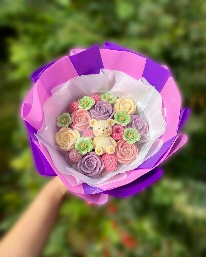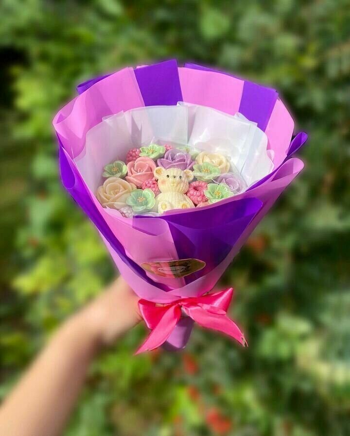 Шоколадный букет "Первая Букетная Москвы ShokoTrendy" - это уникальное и вкусное решение для подарка, которое придется по вкусу каждому. В комплекте с букетом идет мишка, который добавляет особый шарм и делает подарок еще более запоминающимся.