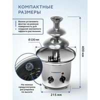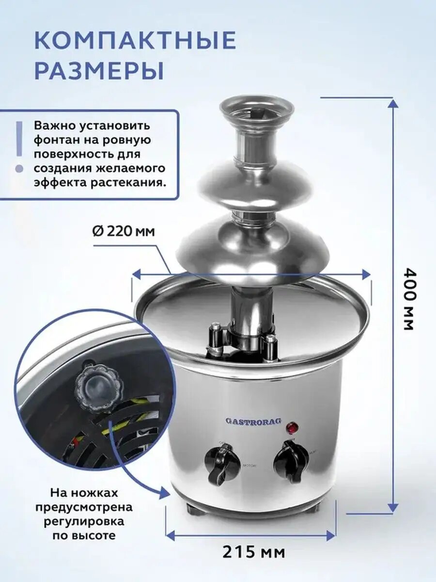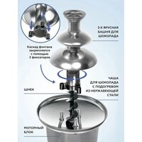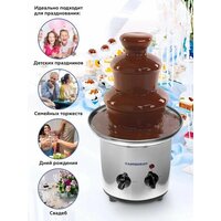 Хотите, чтобы ваш праздник стал особенным? Создать особую праздничную атмосферу вам поможет шоколадный фонтан Chocolate Fondue Fountain Gastrorag CF16A. Это компактный настольный домашний фонтанчик из нержавеющей стали. Мини фондюшница для шоколада доставит огромное удовольствие и радость вашим гостям во время свадеб и юбилеев, банкетов, вечеринок, детских праздников и других торжественных событий. Электрический шоколадный фонтан в дом для имеет шнековую конструкцию высотой 40 см с 3 ярусами и глубокой чашей диаметром 22 см. В чашу мини фондю можно загрузить до килограмма шоколада, который необходимо предварительно растопить на водяной бане или в микроволновке. Не закладывайте в фонтан нерастопленные плитки шоколада: его мощности не хватит на то, чтобы их растопить, а кусочки шоколада могут блокировать шнек и вывести прибор из строя. Шоколад для фонтана рекомендуется использовать с высоким содержанием какао-масла (например, бельгийский) - это избавит вас от необходимости добавлять в массу растительное масло в целях улучшения ее текучести. Растопив шоколад, залейте его в чашу фонтана, включите двигатель шнека и нагрев. Шоколад для фондю начнет подниматься по шнеку и стекать вниз по ярусам, образуя сплошное бархатистое покрывало. Расположите вокруг все необходимые ингредиенты для десерта: кусочки фруктов, ягоды, суфле, мармелад, печенье, вафли и даже нарезанный кубиками сыр - и оригинальный десертный стол для детей и взрослых готов!