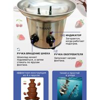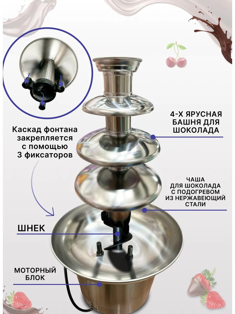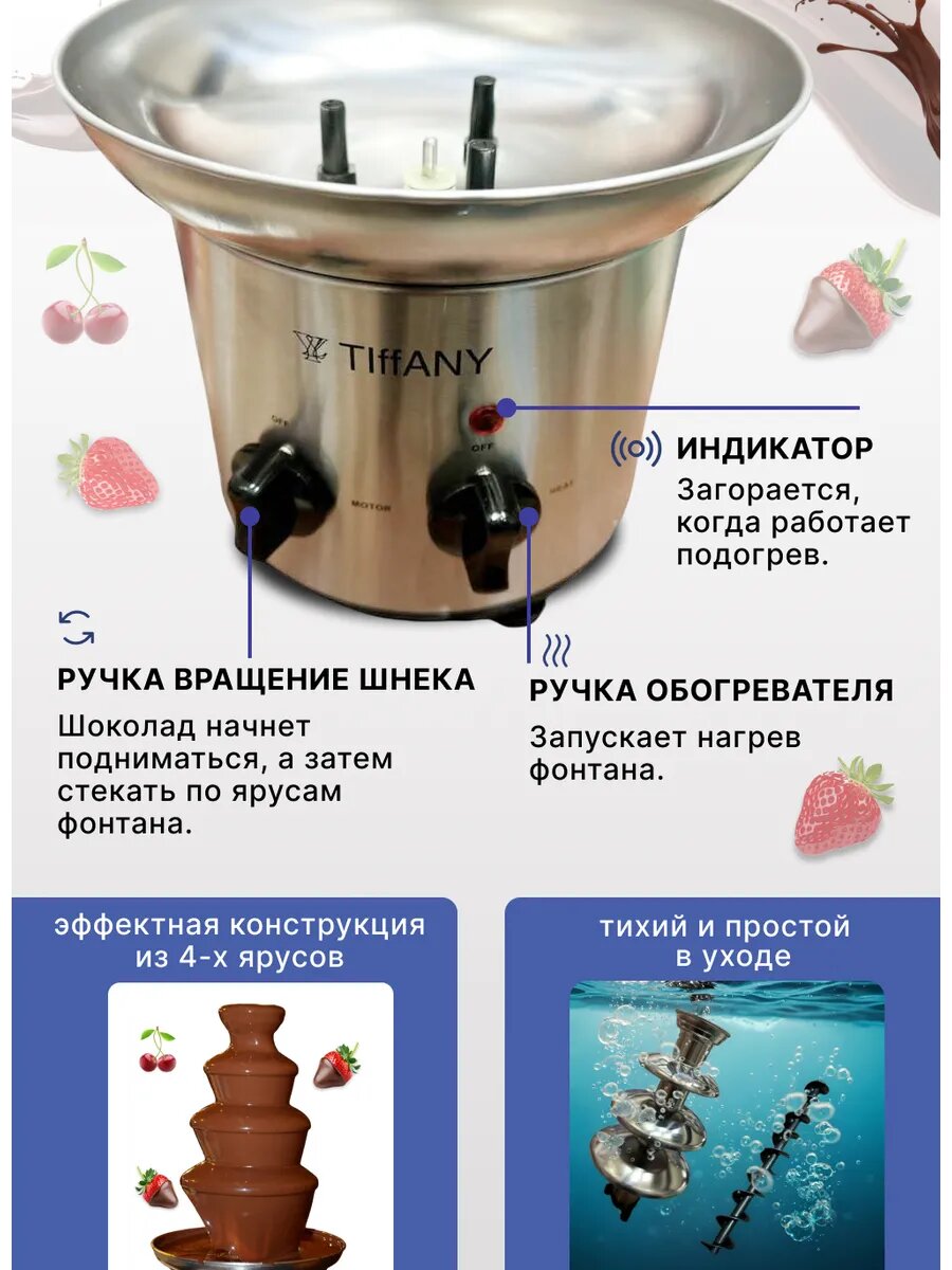 Чтобы насладиться этим сладким удовольствием, просто расплавьте шоколад в специальном отсеке, включите фонтан и позвольте волшебству произойти. Спелые фрукты и ягоды, погруженные в густую шоколадную массу, станут восхитительным дополнением к вашему столу, придавая ему яркость и аппетитность.