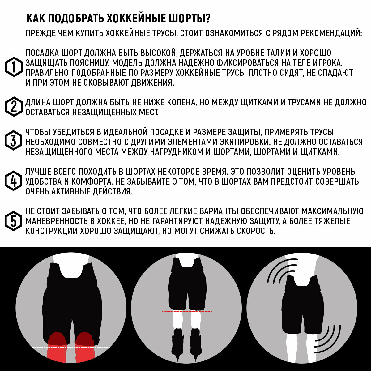 | Дополнительная информация | Прежде чем купить хоккейные трусы, стоит ознакомиться с рядом рекомендаций: · Посадка шорт должна быть высокой, держаться на уровне талии и хорошо защищать поясницу. Модель должна надежно фиксироваться на теле игрока. Правильно подобранные по размеру хоккейные трусы плотно сидя, не спадают и при этом не сковывают движения. · Длина шорт должна быть не ниже колена, но между щитками и трусами не должно оставаться незащищенных мест. Можно купить модель с функцией удлинения на 1 дюйм, эта функция реализована в топовых, предтоповых и полупрофессиональных моделях шорт ССМ. Это оптимальный вариант для игроков любого роста. Кроме того, такие шорты рекомендованы к покупке для детей и подростков. · Чтобы убедиться в идеальной посадке и размере защиты, примерять трусы необходимо совместно с другими элементами экипировки. Не должно оставаться незащищенного места между нагрудником и шортами, шортами и щитками. · Лучше всего походить в шортах некоторое время. Это позволит оценить уровень удобства и комфорта. Не забывайте о том, что в шортах вам предстоит совершать очень активные действия. · Не стоит забывать о том, что более легкие варианты обеспечивают максимальную маневренность в хоккее, но не гарантируют надежную защиту, а более тяжелые конструкции хорошо защищают, но могут снижать скорость. Обычно более легкие модели, как в линейке JETSPEED, используются нападающими, а для защитников чаще рассматривают линейку TACKS. Однако итоговое решение остается за хоккеистом. Чтобы хоккейные шорты идеально подходили игроку по размеру, стоит учитывать следующие параметры: · вес; · рост; · обхват талии. Для начала необходимо снять замеры и сверить их с таблицей производителя. Это позволит подобрать правильный размер экипировки для хоккея. Если вы хотите купить хоккейные трусы для ребенка или подростка, не рекомендуем брать изделие «на вырост». Если вы хотите сэкономить, лучше всего приобрести модель-трансформер. Ее размер можно регулировать. Также не стоит экономить на защите, покупая форму с рук. Для новичков и любителей подойдут более простые и дешевые варианты экипировки, а для профессиональных хоккеистов требуется защита высокого уровня. |