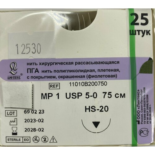 ПГА нить плетеная Полигликолид, USP 5-0 (МР 1) фиолетовая 75 см, с иглой Режущая HS-20, (25 шт/уп), шовный хирургический материал Линтекс (Россия): сравнение цен, характеристики, фото, актуальное наличие и цены.
