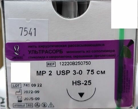 Ультрасорб мононить Полиглекапрон, USP 3-0 (МР 2) фиолетовая 75 см, с иглой режущая HS-25, (5 шт/уп), шовный хирургический материал линтекс (Россия): сравнение цен, характеристики, фото, актуальное наличие и цены.