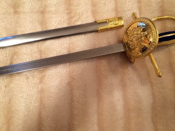 Данное изделие является сувенирной продукцией. Характеристики: Материал клинка сталь 440С Заточка отсутствует Материал ножен дерево, обтянутое кожазамом Материал рукояти пластик и металл Все декоративные элементы металл Пр-во Китай