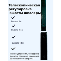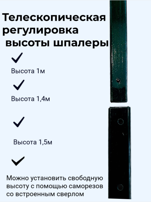 За счет телескопической конструкции возможна регулировка высоты шпалеры: фиксированная по подготовленным отверстиям высота будет 1м или1,4м или 1,5м. Также можно закрепить на любой нужной высоте с помощью саморезов со встроенным сверлом (входят в комплект), закручиваются в металл шуруповертом без проблем.