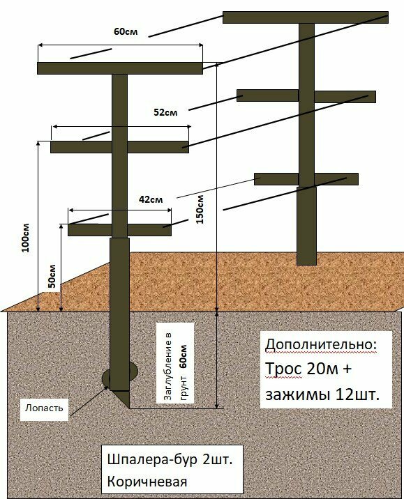 Шпалера-бур комплект из 2шт, служит как самостоятельная шпалера. Высота 1,5м, ширина 0,6м. Цвет венге (темно-коричневый). В комплект входит специальный шпалерный трос 2,5мм 20м и зажимы 12шт для фиксации троса в 12 точках крепления.