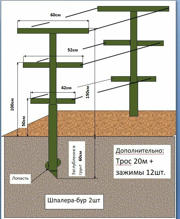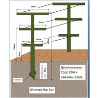 Шпалера-бур комплект из 2шт, служит как самостоятельная шпалера. Высота 1,5м, ширина 0,6м. Цвет зеленый. В комплект входит специальный шпалерный трос 2,5мм 20м и зажимы 12шт для фиксации троса в 12 точках крепления.