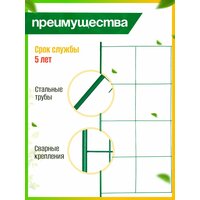 Опора под растения защищена 3 слоями краски, что обеспечивает долговечность и устойчивость к коррозии в отличии от шпалеры из дерева. Шпалера для клематиса подходит для различных растений: от малины, винограда и плетистых роз до перголы садовой, зеленого горошка и огурцов. Она станет отличным решением не только для поддержания растений, но и для создания оригинального декора для сада.