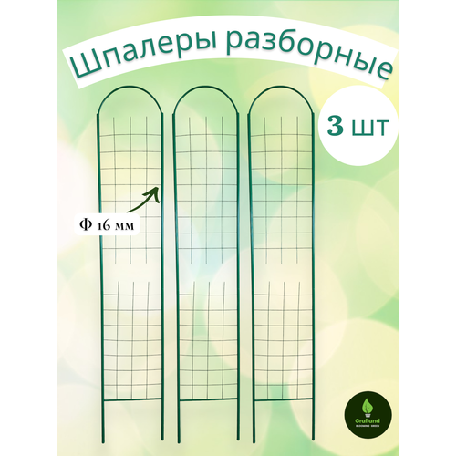 Шпалера разборная металлическая сделана из трубы стальной электросварной диаметром 16 мм. Стальная сетка имеет диаметр 2,5 мм, размер ячейки 9х9 см. Покрытие шпалеры - порошковая эмаль - прочное и долговечное.